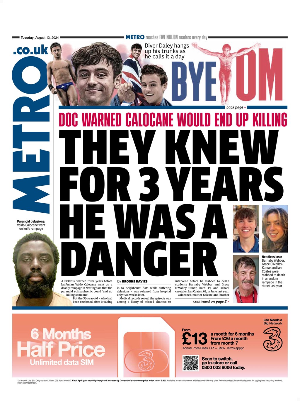 Metro reports that a doctor had warned three years prior that paranoid schizophrenic Valdo Calocane might “end up killing someone” before his deadly rampage in Nottingham.
