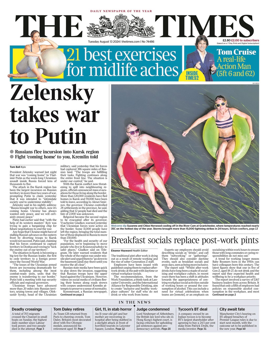 The Times reports President Zelenskyy has declared that war is now affecting Putin directly, as a Ukrainian offensive in Russia has caused mass evacuations.