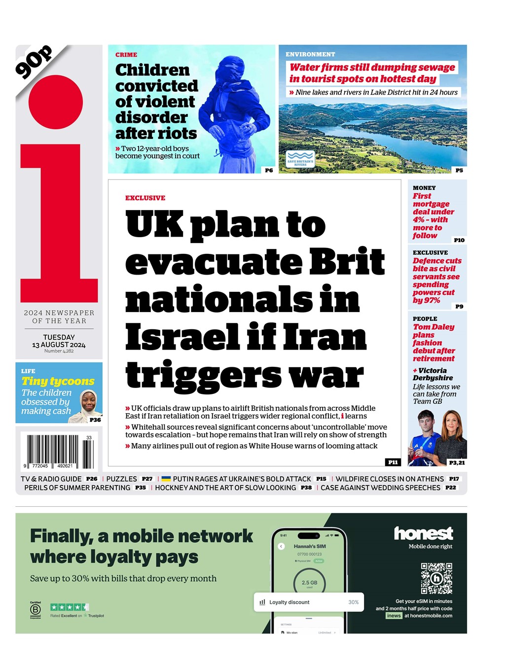 The i reports that officials have prepared plans to evacuate British nationals from the Middle East if Iranian retaliation against Israel leads to a wider regional conflict.