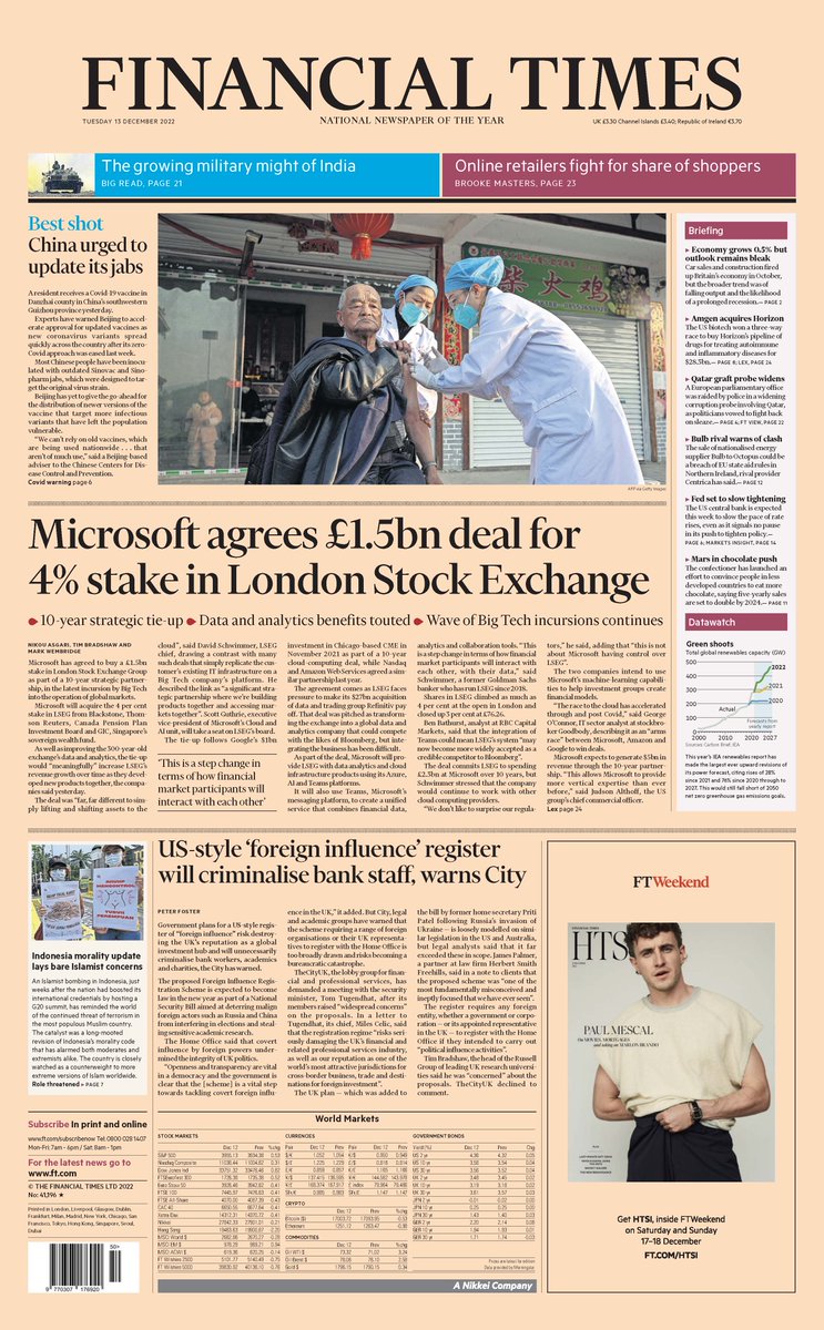 FT reports that Microsoft has agreed to buy a 4% stake in London Stock Exchange Group for $1.5 billion (£1.22 billion).