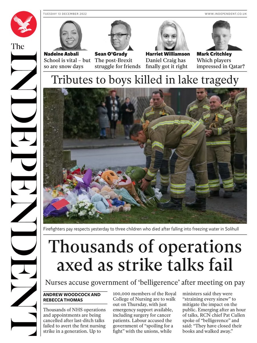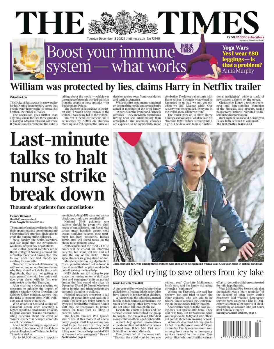 The Times front page reports that talks to avoid a nursing strike on Thursday have failed.