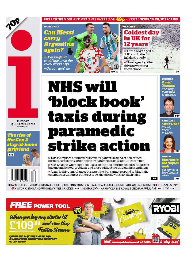 According to the I, ambulances will be driven by Army members during paramedic strikes, along with taxis.