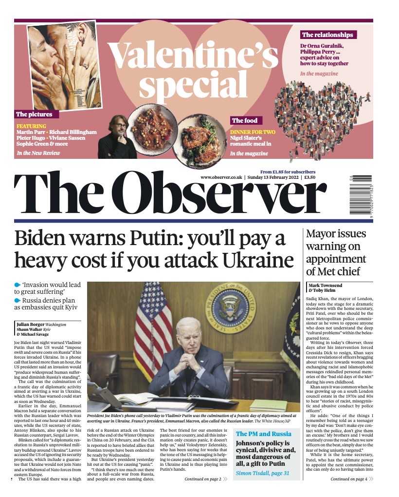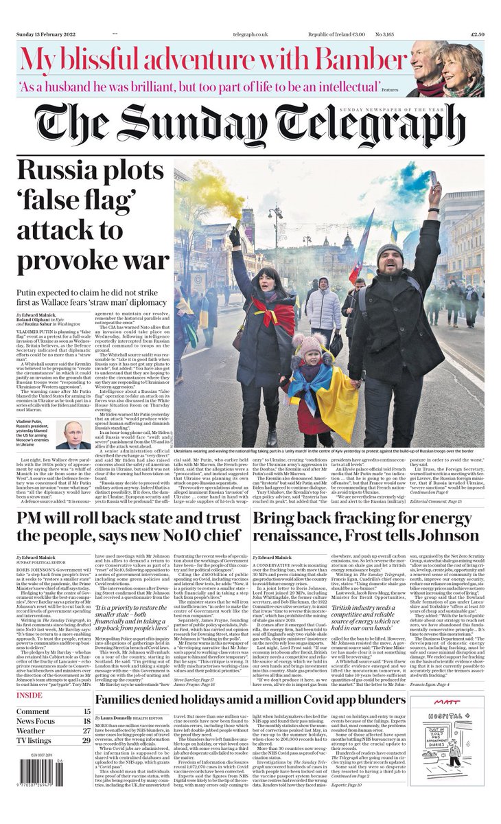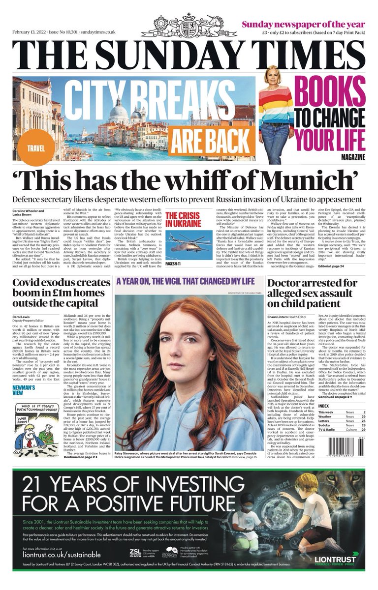 On its front page, The Sunday Times focuses on remarks by British Defence Secretary Ben Wallace, who has said there is a “whiff of Munich in the air” as the West engages in last-minute diplomatic efforts to stop Russian aggression.