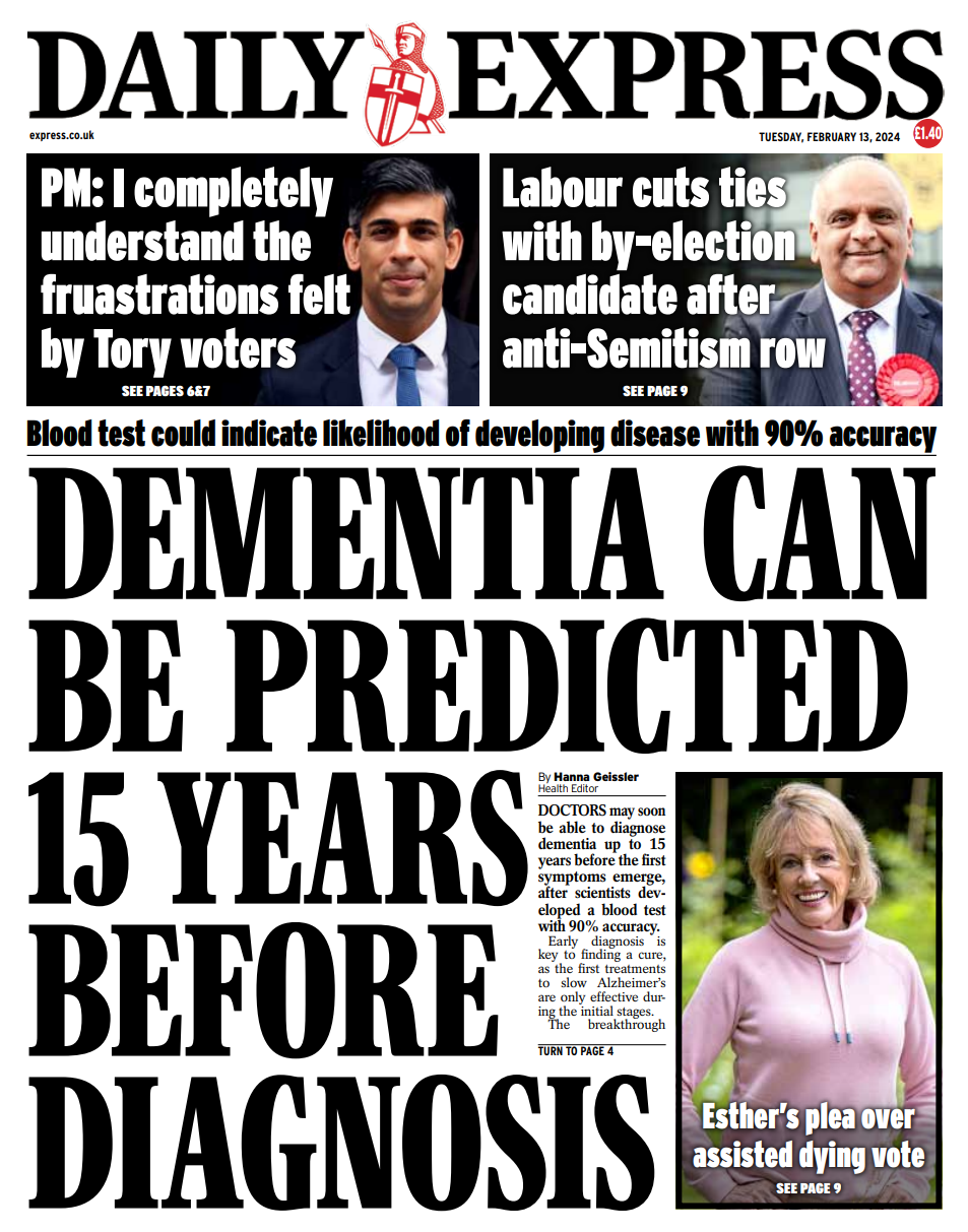 The Daily Express reports on a medical study suggesting dementia can be predicted 15 years prior to symptoms via a simple blood test.