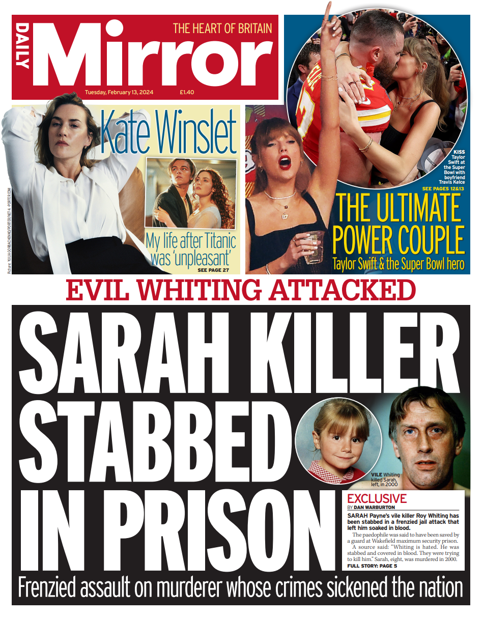 The Daily Mirror leads with the story of Sarah Payne’s killer, Roy Whiting, being attacked in jail.