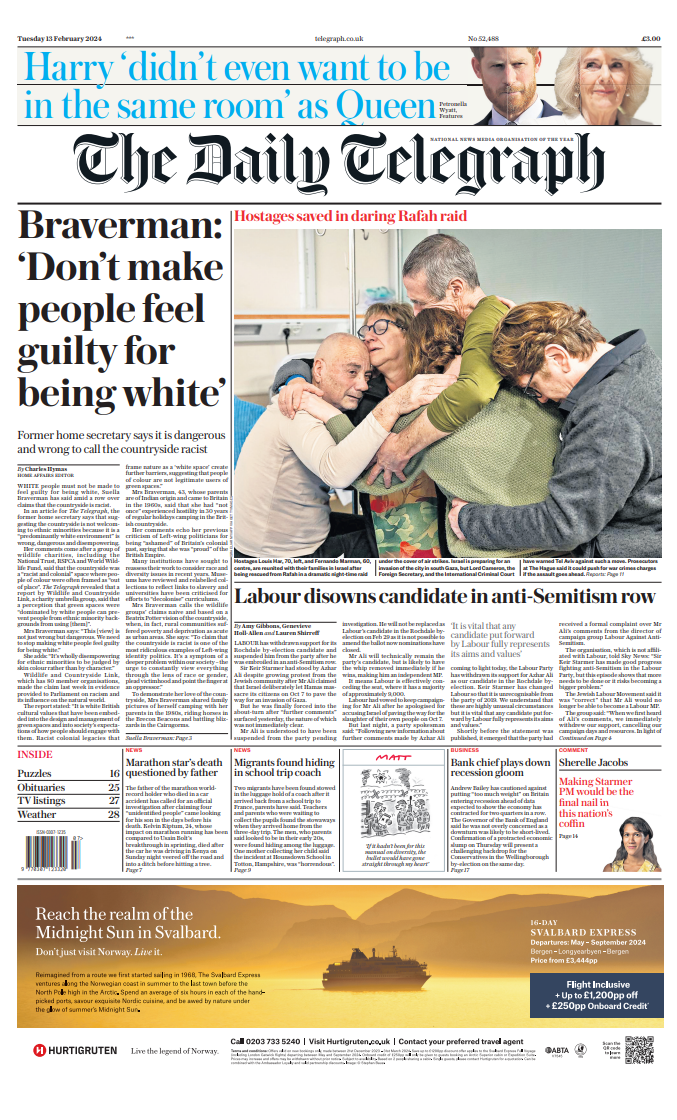 The Daily Telegraph reports Suella Braverman’s stance against making whites feel guilty following charities’ racist countryside claims.