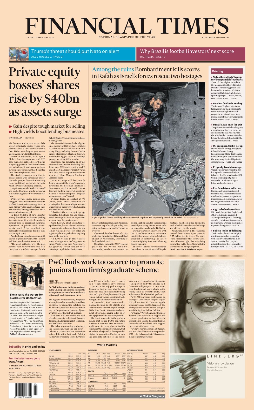 The Financial Times highlights a $40bn growth in private equity chiefs’ portfolios due to rising interest rates.