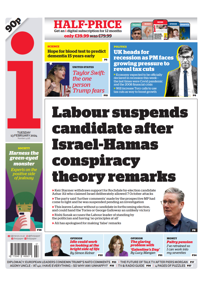 The i paper reports Labour suspending Azhar Ali, a Rochdale candidate, over conspiracy theory remarks.