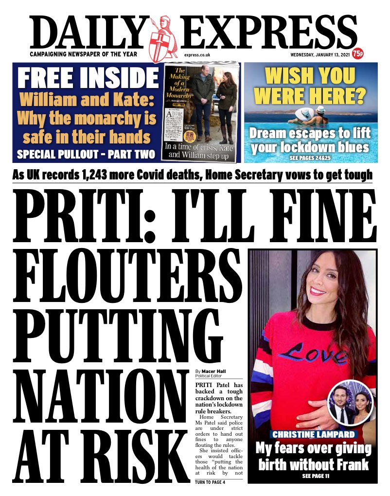 Home Secretary Priti Patel’s pledge to take a stricter approach to policing coronavirus rules is on the front of the Daily Express.