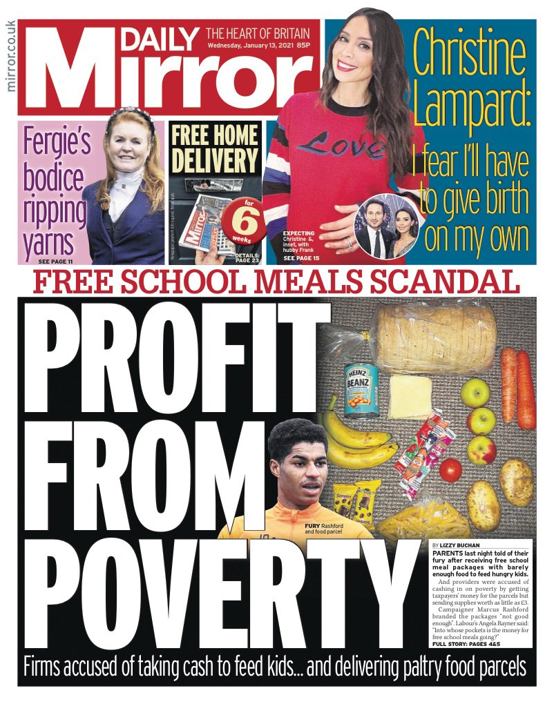 Private contractors, responsible for the government’s paltry £30 food parcels for hungry children, sent supplies worth as little as £3, the Daily Mirror says.