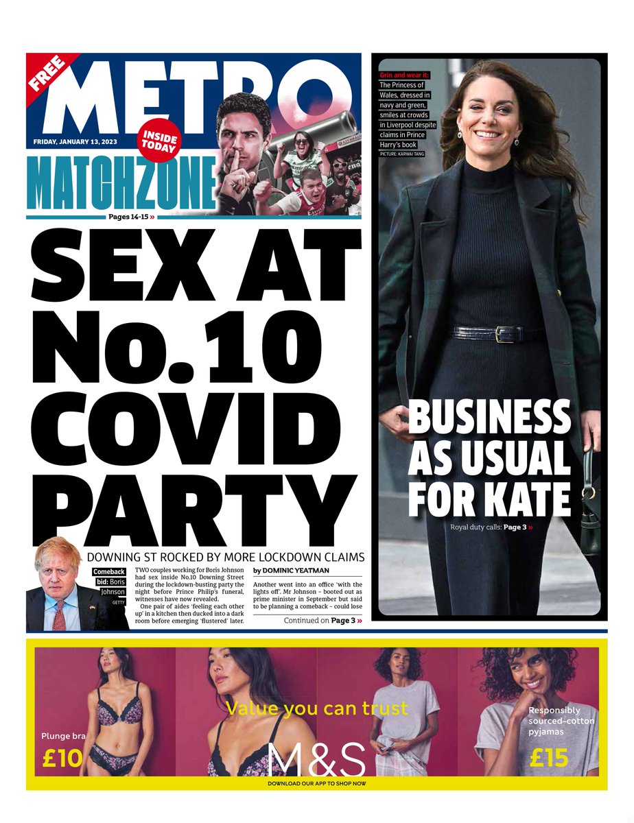 Metro reports allegations that two couples working for Boris Johnson had sex at a lockdown-breaking party in Downing Street the day before Prince Philip’s funeral.