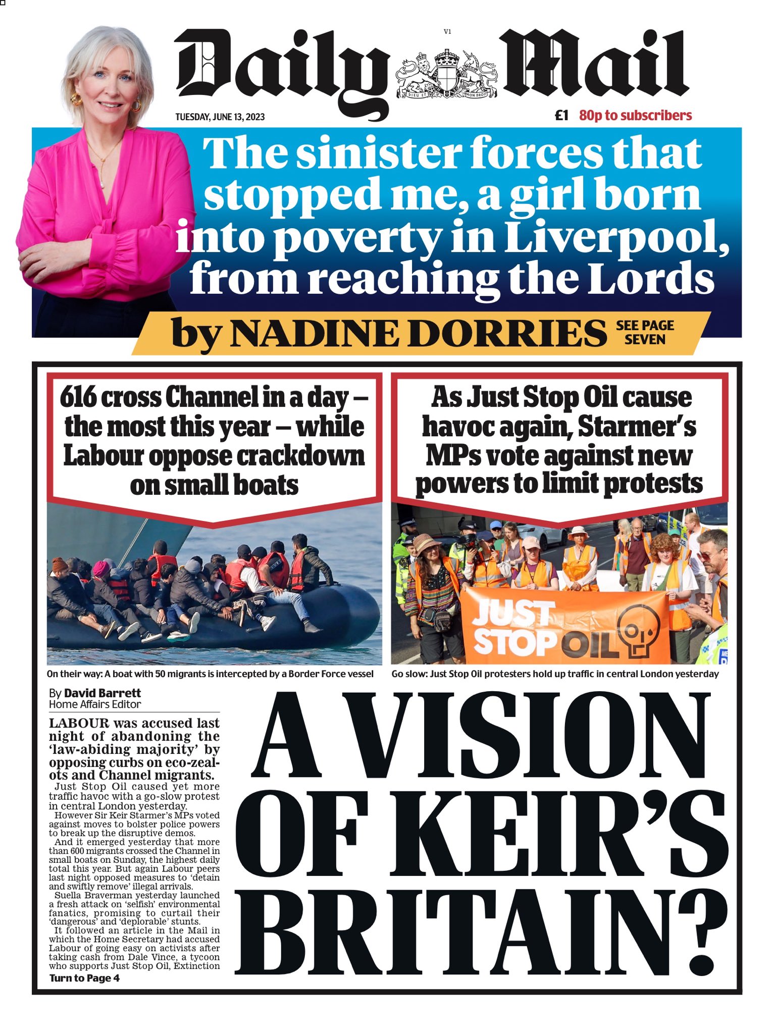 The Daily Mail’s front page showcases images of migrants crossing the Channel and an oil protest in London, questioning if this is a vision of a future Britain under Keir Starmer.