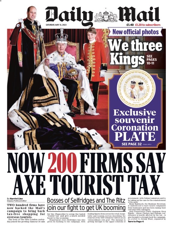 The Daily Mail reveals that 200 firms support its campaign to reinstate tax-free shopping for overseas tourists.
