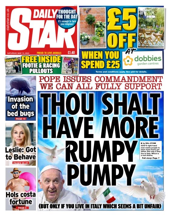 The Daily Star highlights Pope’s urging for Italians to have more “rumpy pumpy” to increase the country’s birth rate.