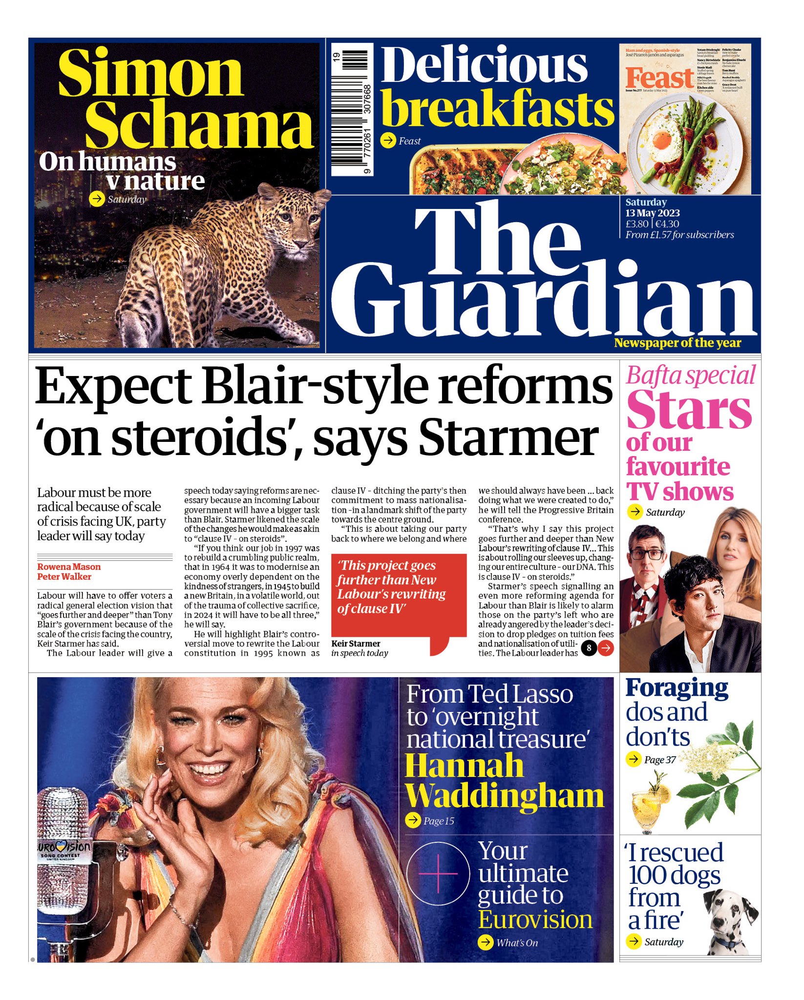 The Guardian leads with Labour leader Sir Keir Starmer’s upcoming speech, where he’ll call for a more radical approach than Tony Blair’s government due to the UK’s crisis.