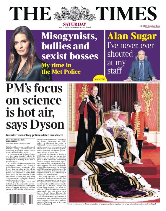 The Times features a warning from Sir James Dyson that Conservative policies are deterring investment in the science and technology sectors.