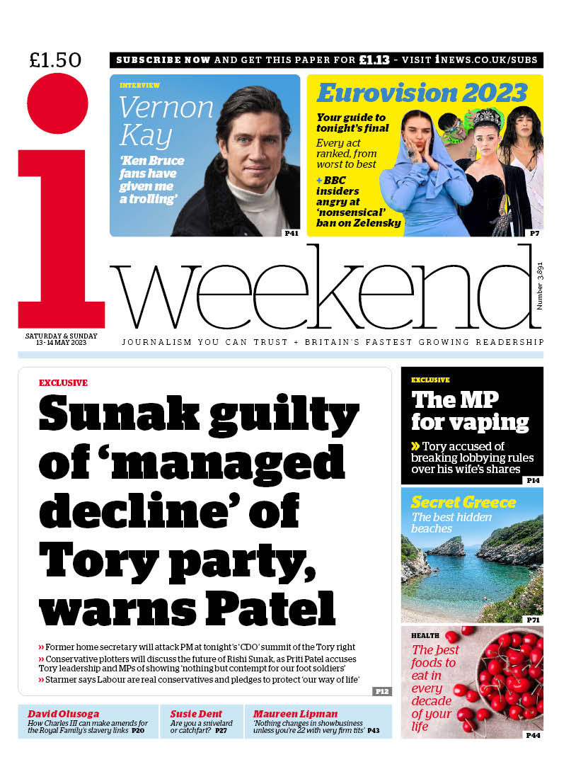 The iWeekend reports that former Home Secretary Priti Patel is expected to accuse Prime Minister Rishi Sunak of the “managed decline” of the Conservative Party at a Tory summit.