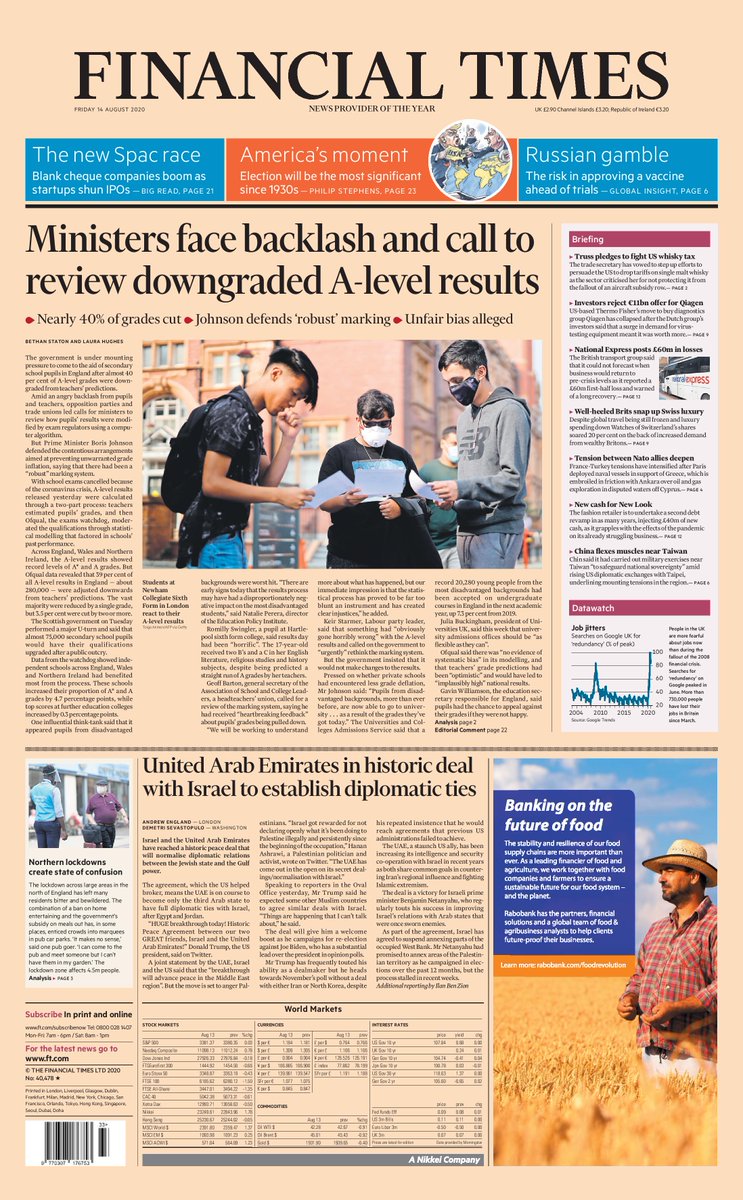 Almost 40% of A-level grades have been downgraded from teachers’ predictions, according to the Financial Times.