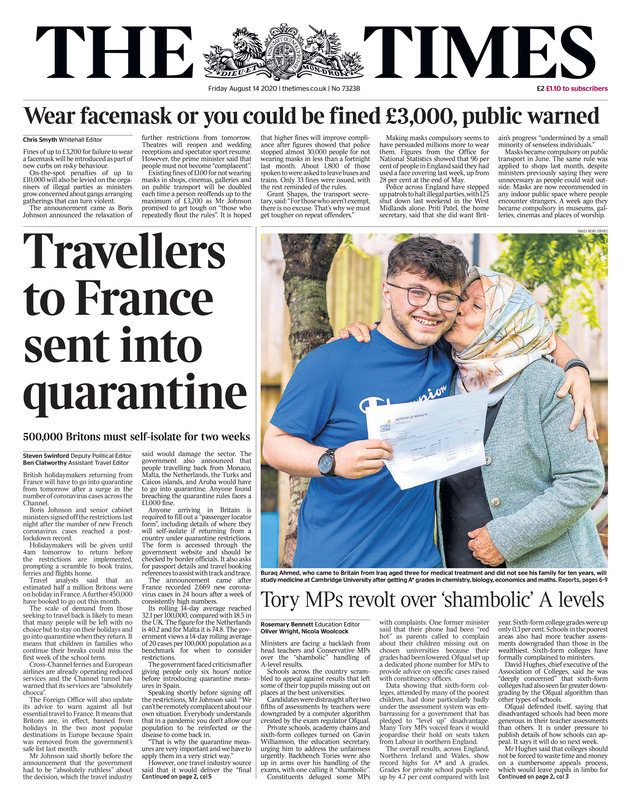The Times leads with the news that people returning from France will have to isolate for two weeks due to a resurgence in coronavirus cases across the Channel.