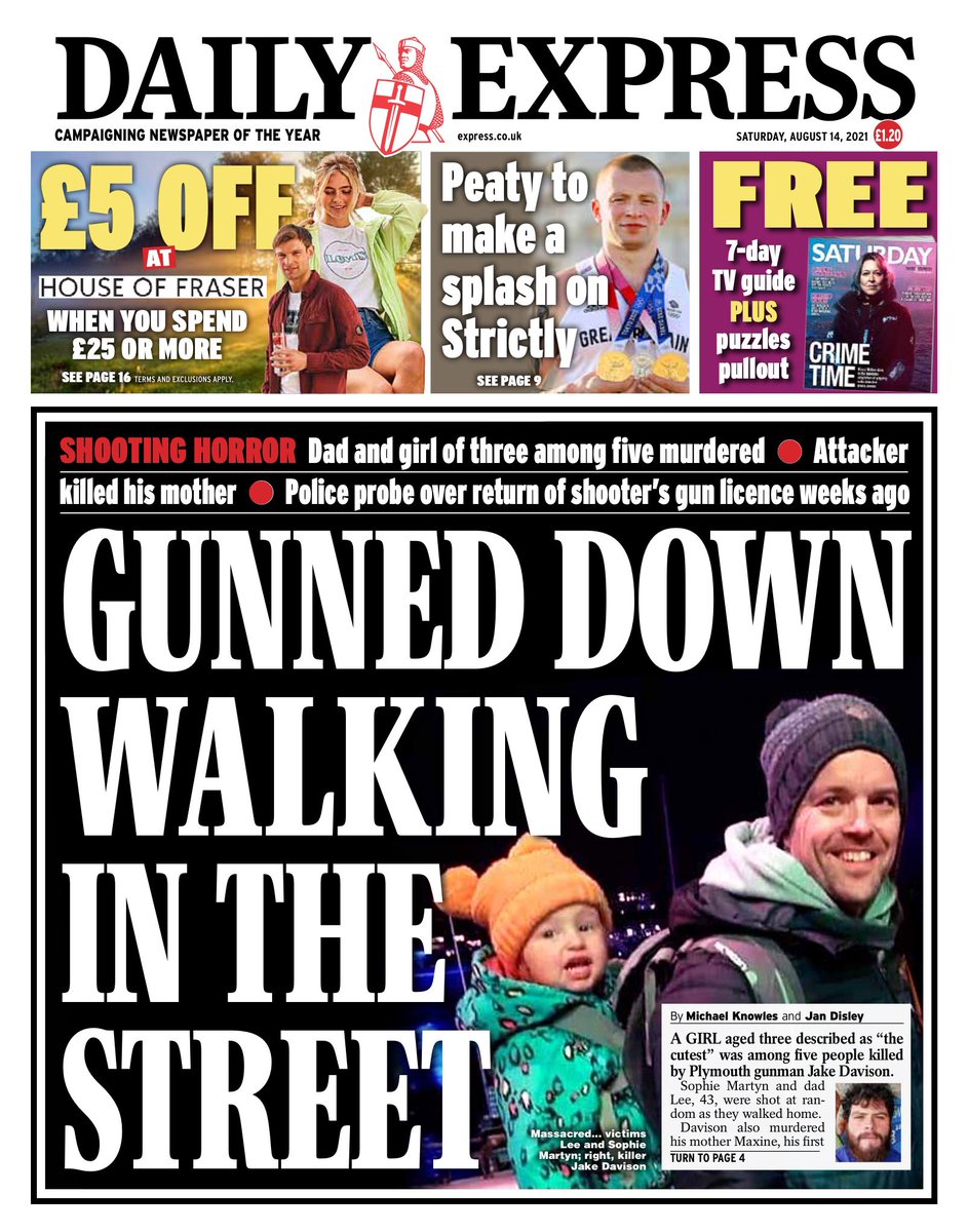 A three-year-old girl was among five people killed by a gunman in Plymouth, the Daily Express reports.