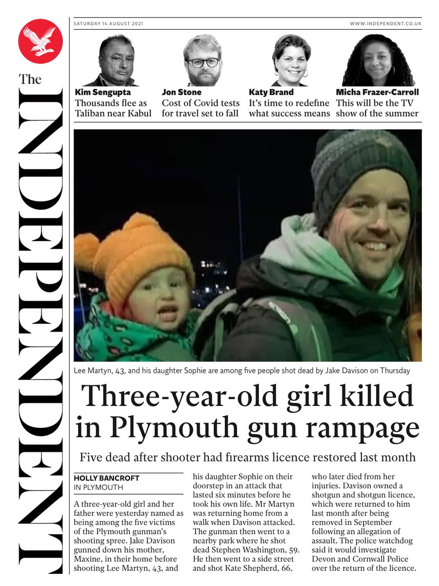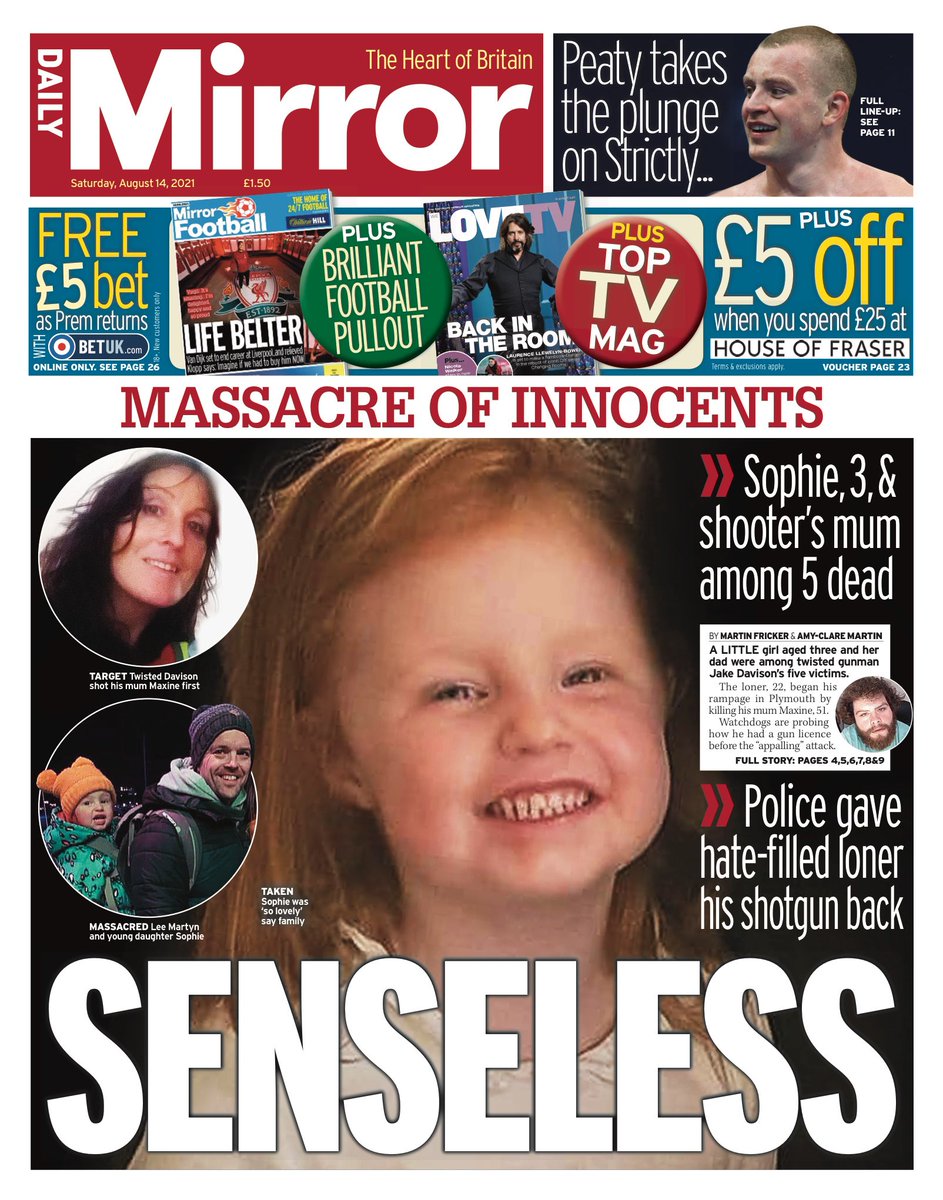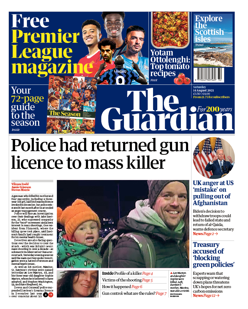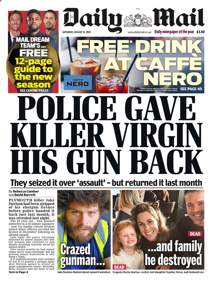 Plymouth gunman Jake Davison had been “stripped of his shotgun licence before police handed it back last month”, the Daily Mail reports.