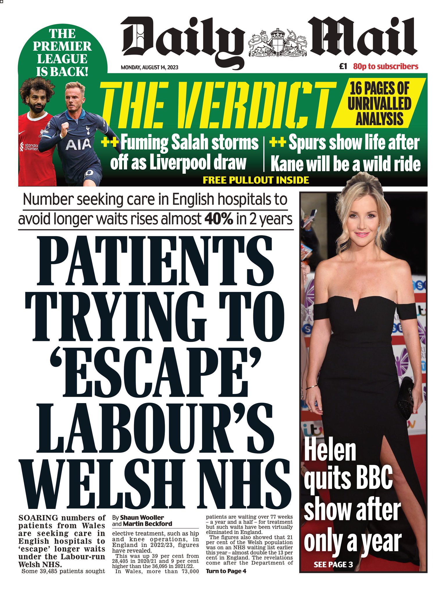 The Daily Mail’s headline story is about the increasing number of patients in Wales crossing the border into England to seek NHS treatment and avoid long waiting lists.