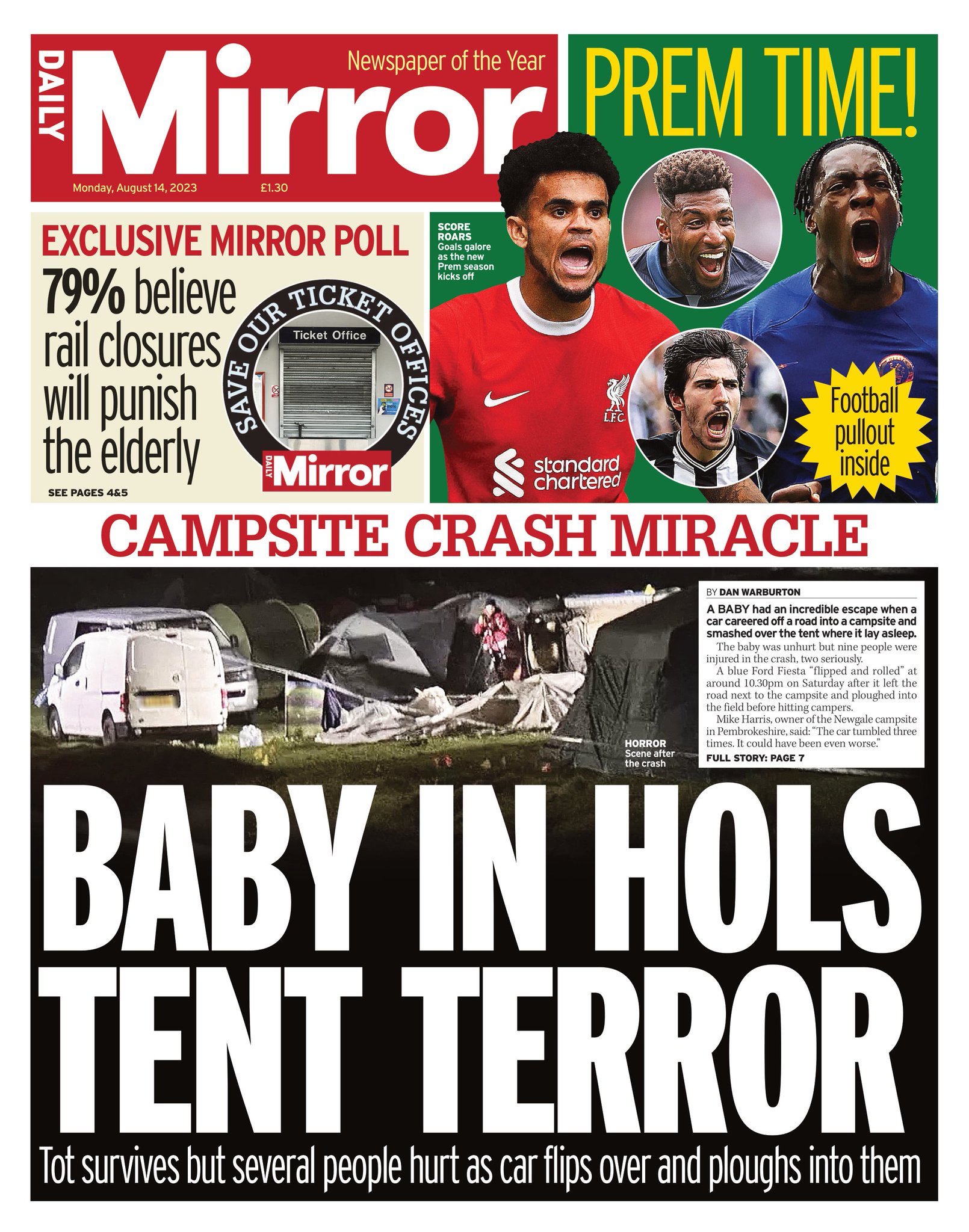 The Daily Mirror leads with a story about a baby’s miraculous escape without injury after a car crashed into a Welsh holiday campsite, injuring nine others.