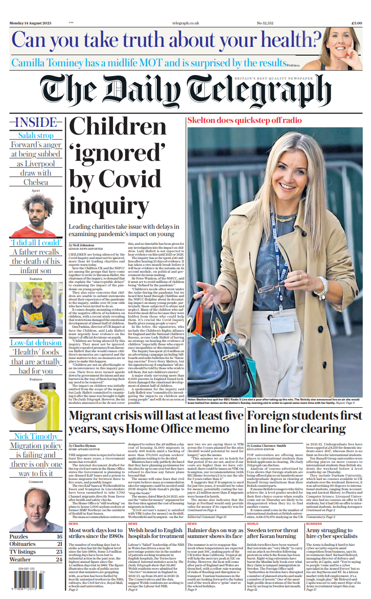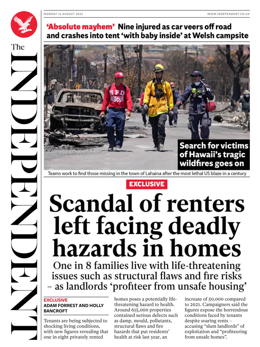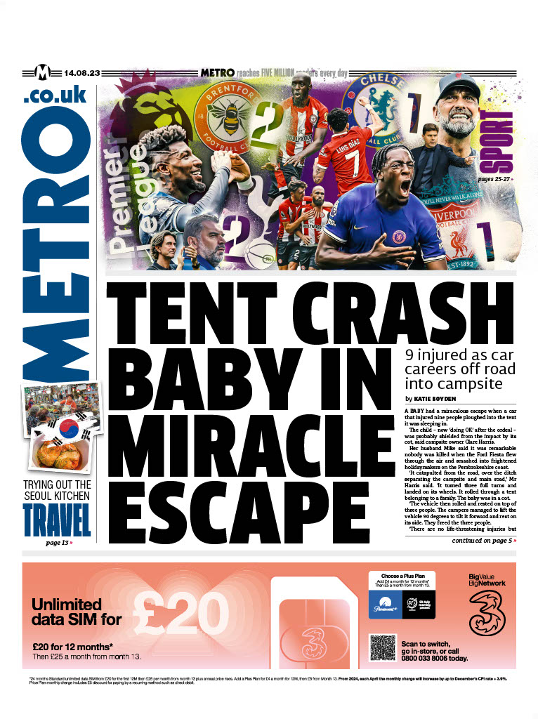 The Metro also highlights the story of a baby’s escape from injury when a car ploughed into a campsite in Wales, hurting nine others.