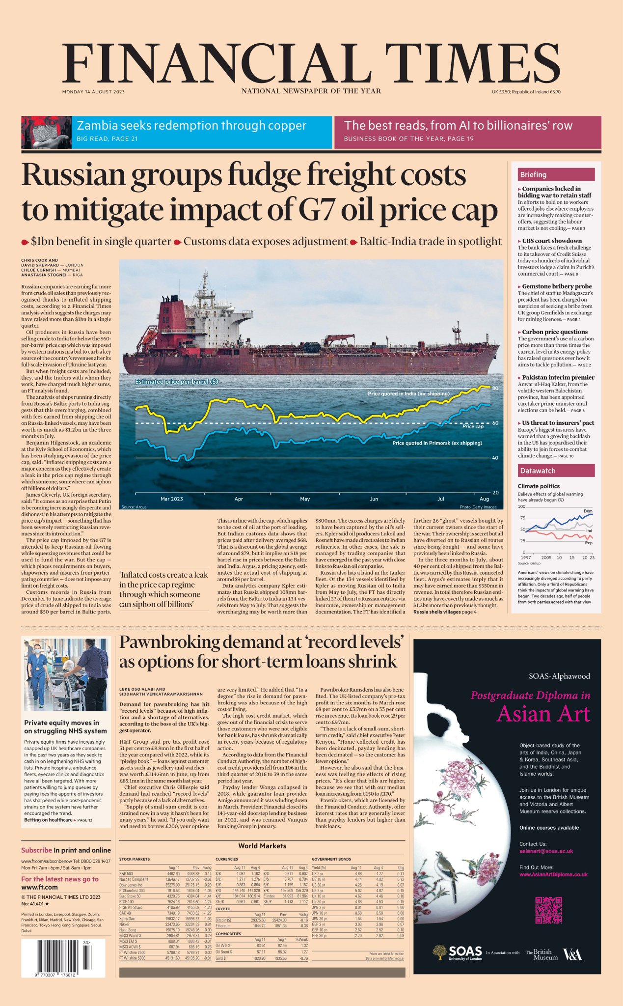 According to the Financial Times, Russian firms may have earned up to $1bn more from crude oil sales in a single quarter, due to inflated shipping costs.