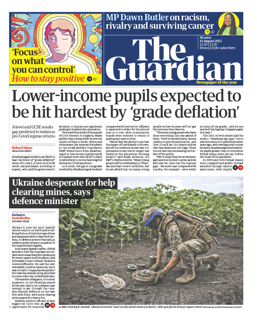 The Guardian emphasises the potential impact of “grade deflation” on pupils from poorer backgrounds as GCSE and A-level results approach.