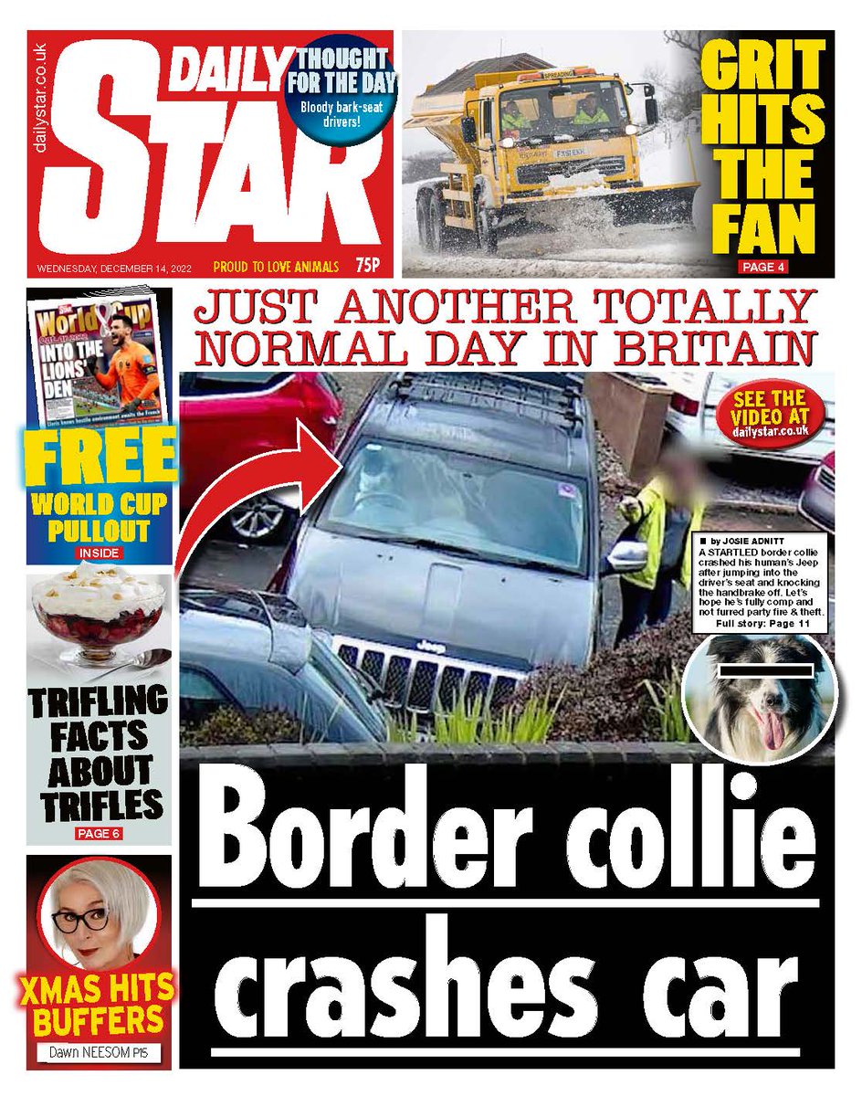 The Daily Star’s front page features an article about a border collie who crashed a Jeep.
