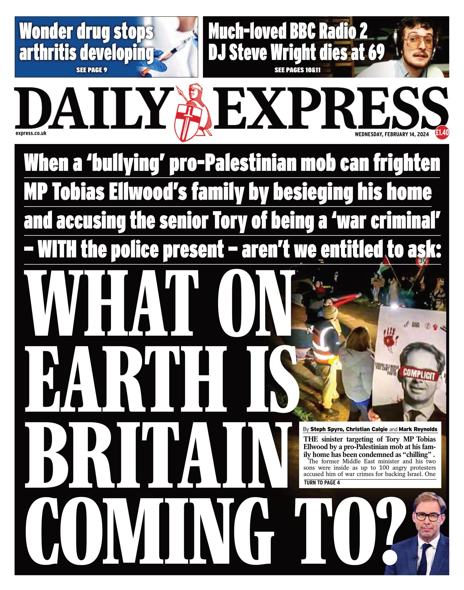 The Daily Express reports on pro-Palestinian protesters labelling Tory MP Tobias Ellwood a “war criminal”.