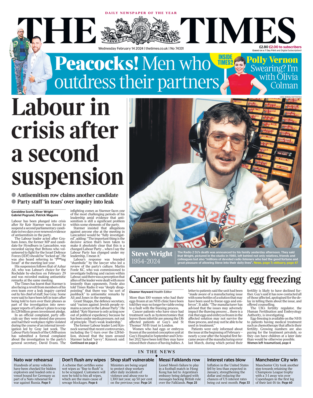 The Times reports on the Labour Party’s crisis as Sir Keir Starmer suspends a second candidate over antisemitism claims.