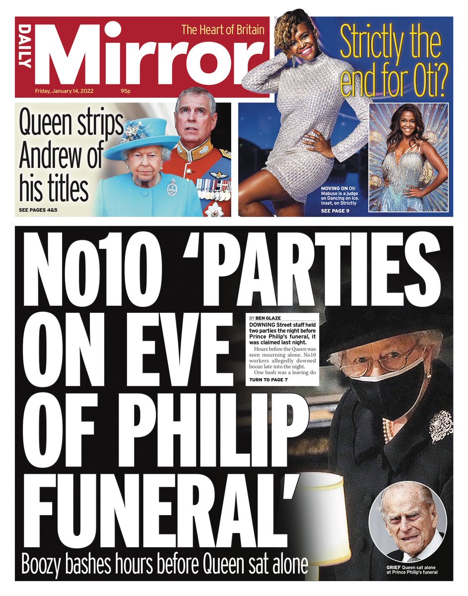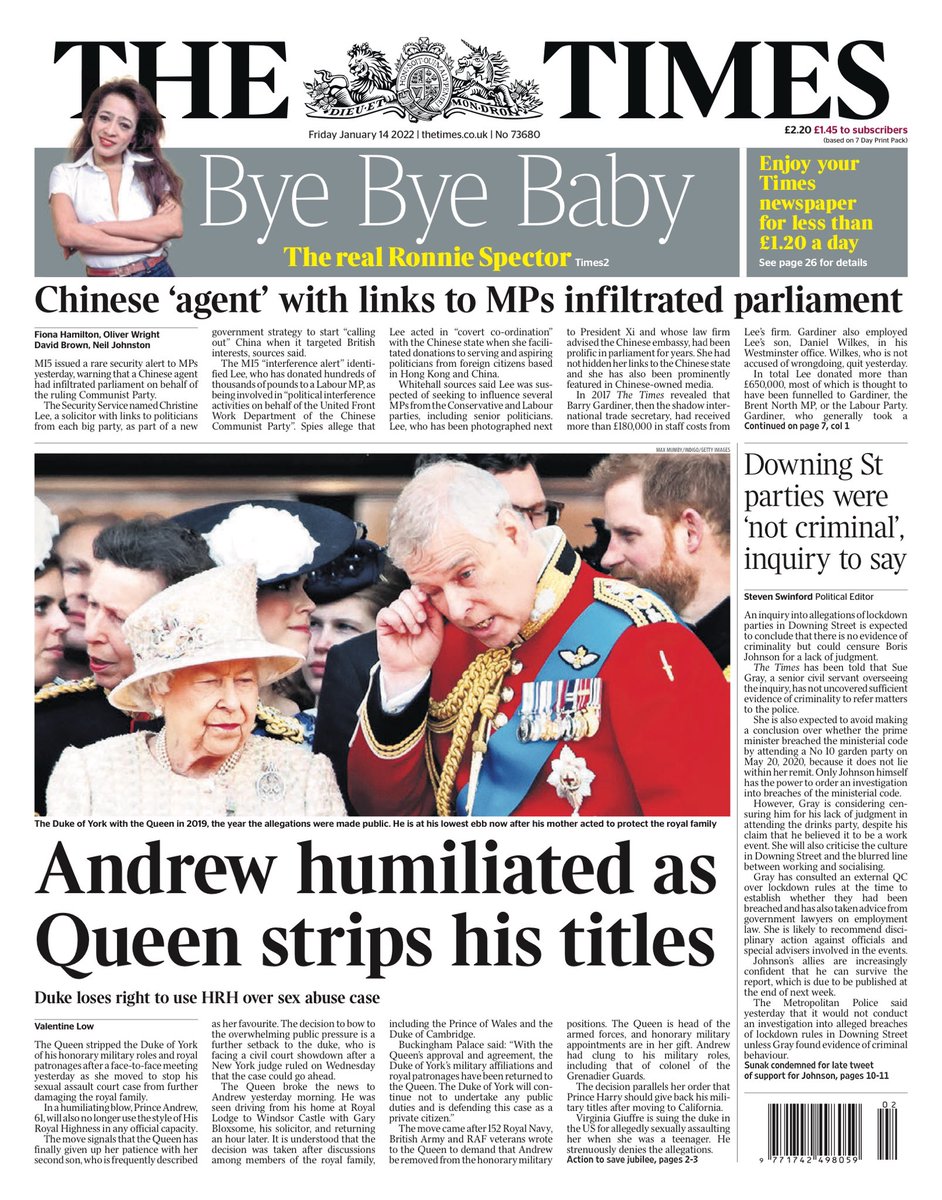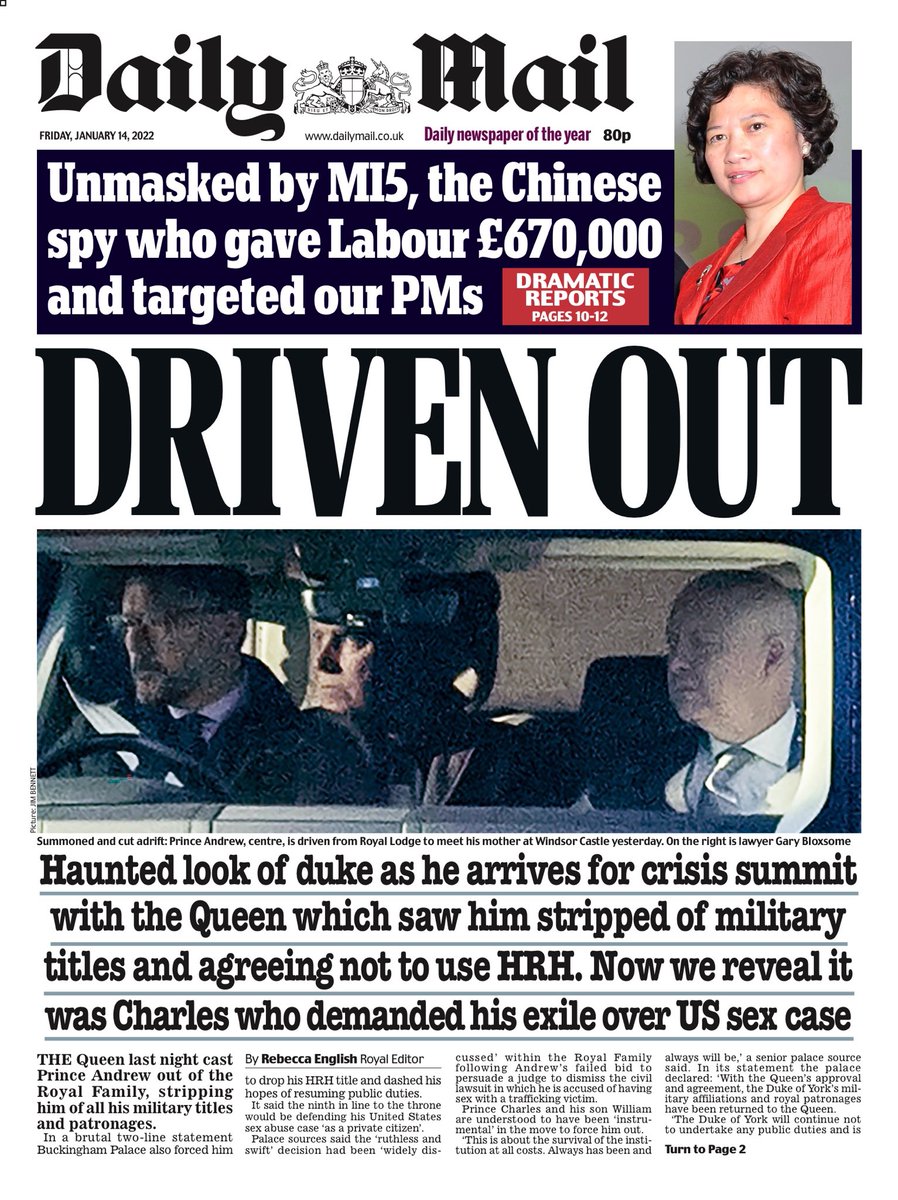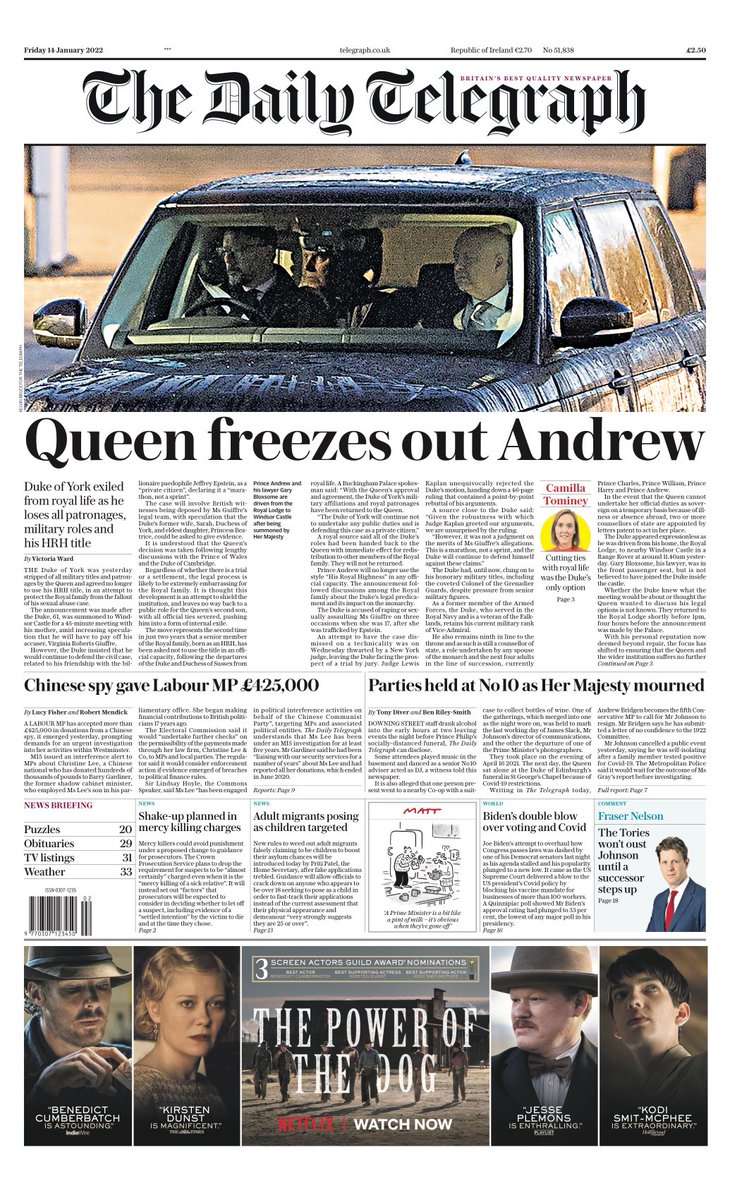 The Times leads with the news the Duke of York has lost his honorary military roles and royal patronages after a face-to-face meeting with the Queen on Thursday.