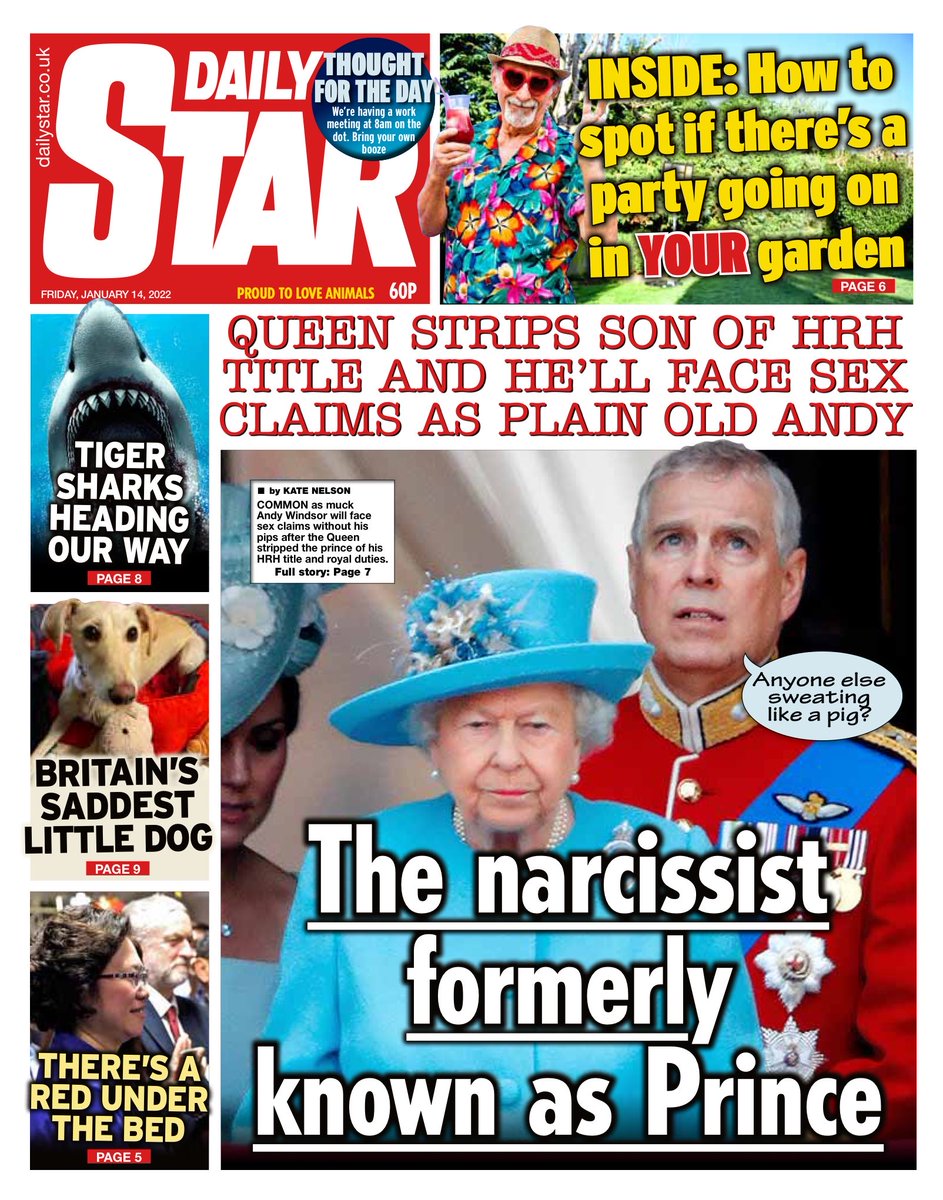 The Daily Star splashes on the news the Queen has stripped her son of his royal and military titles.
