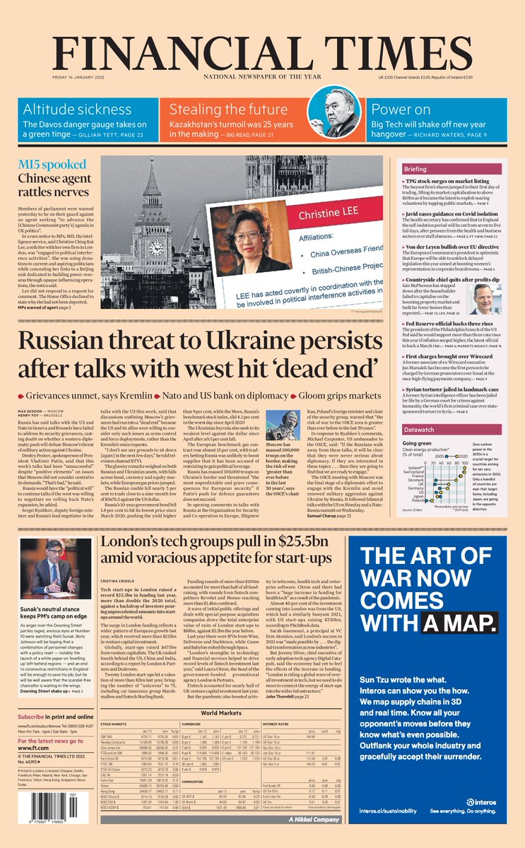 Russia has said talks with the US and Nato in Geneva and Brussels have failed to address its security grievances, reports the Financial Times.