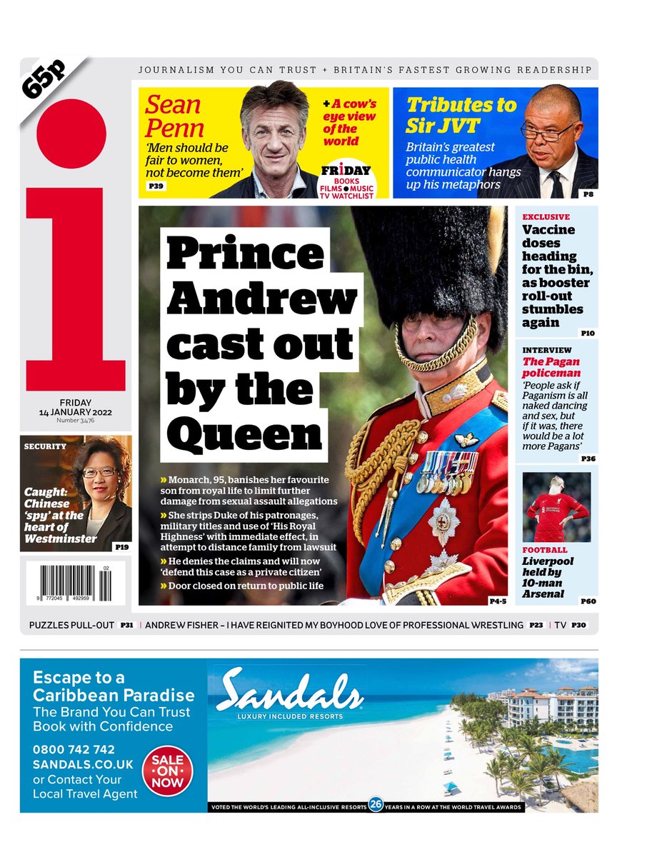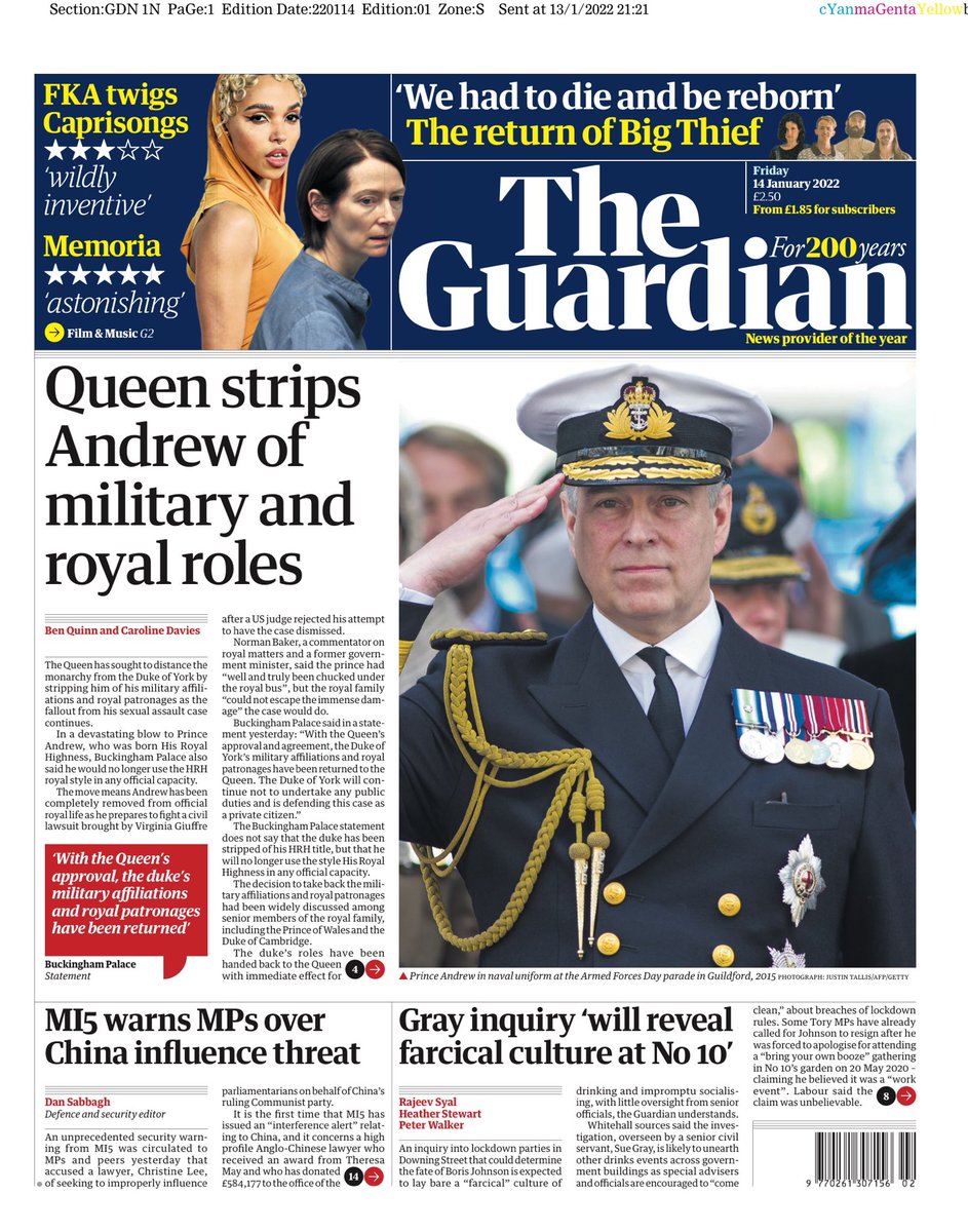 The Guardian splashes on the Queen seeking to distance herself from Prince Andrew, stripping him of his military and royal roles.