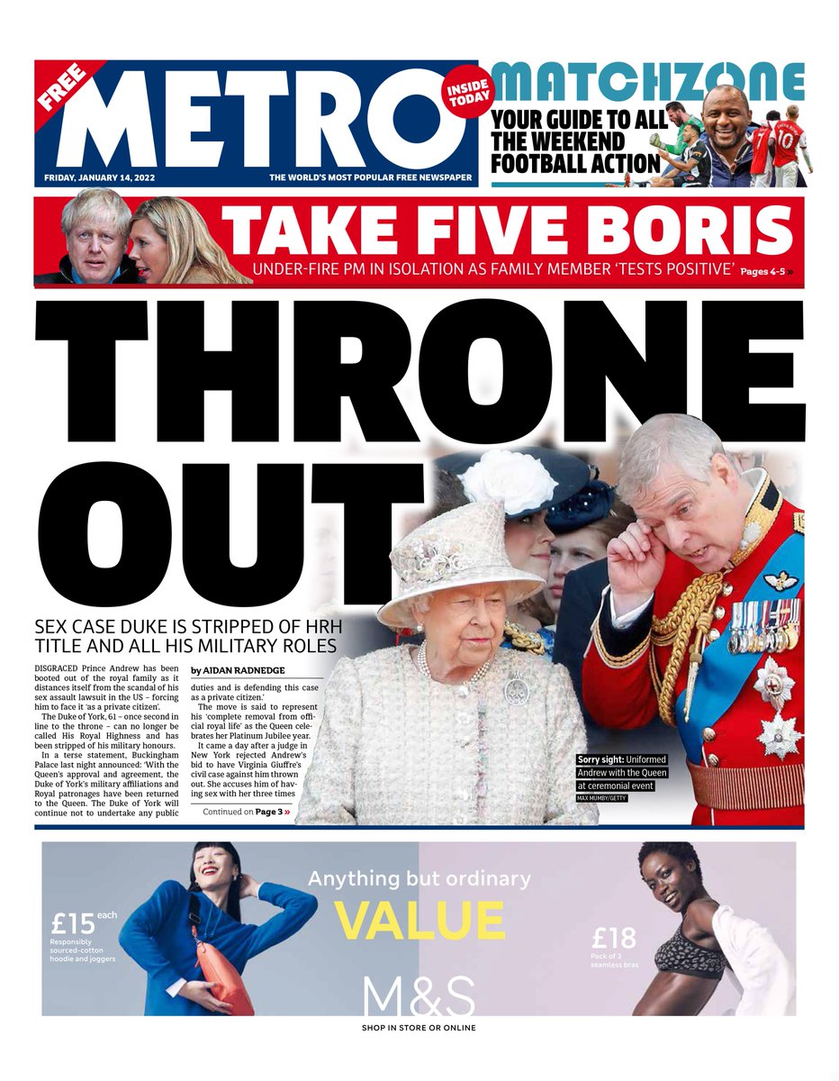 The Metro reports Prince Andrew has been “booted out of the royal family” as it distances itself from the scandal of his sexual assault lawsuit in the US.