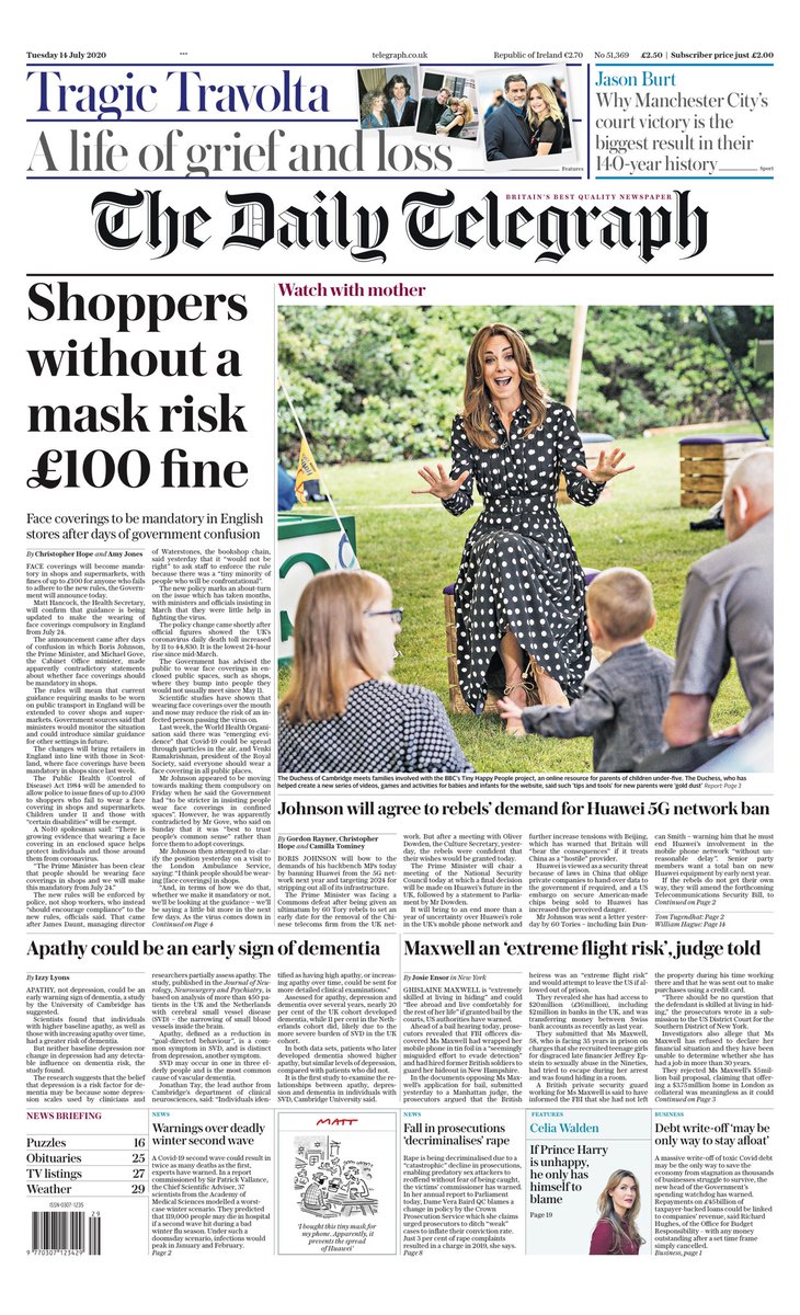 Face coverings will become mandatory in shops and supermarkets in England, with people who refuse to use one liable for a fine of up to £100, reports The Daily Telegraph.