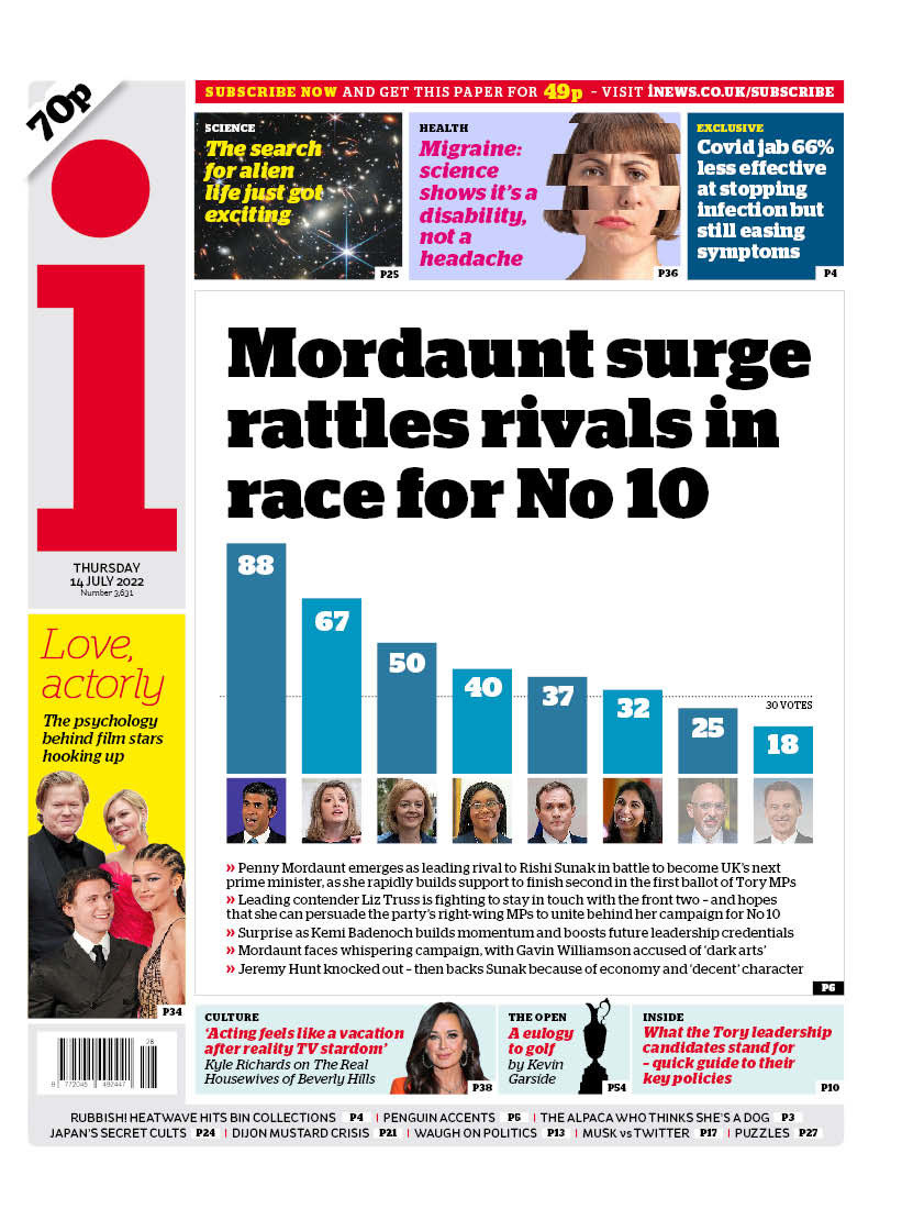Also dominating the front page of the i is the surge of support for Tory Penny Mordaunt to become Prime Minister.