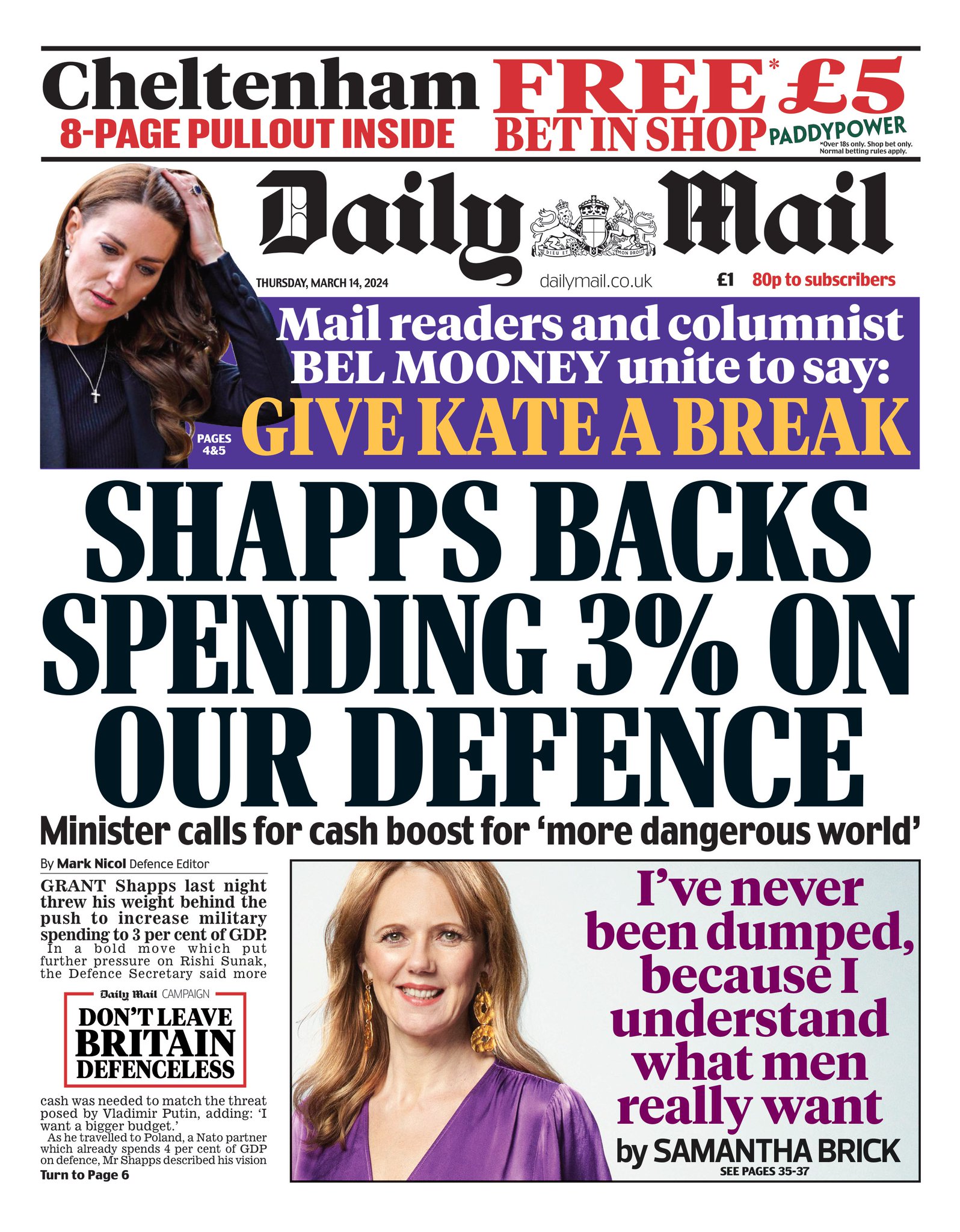 Daily Mail reports Grant Shapps’ call for a UK military spending hike during his Poland trip.