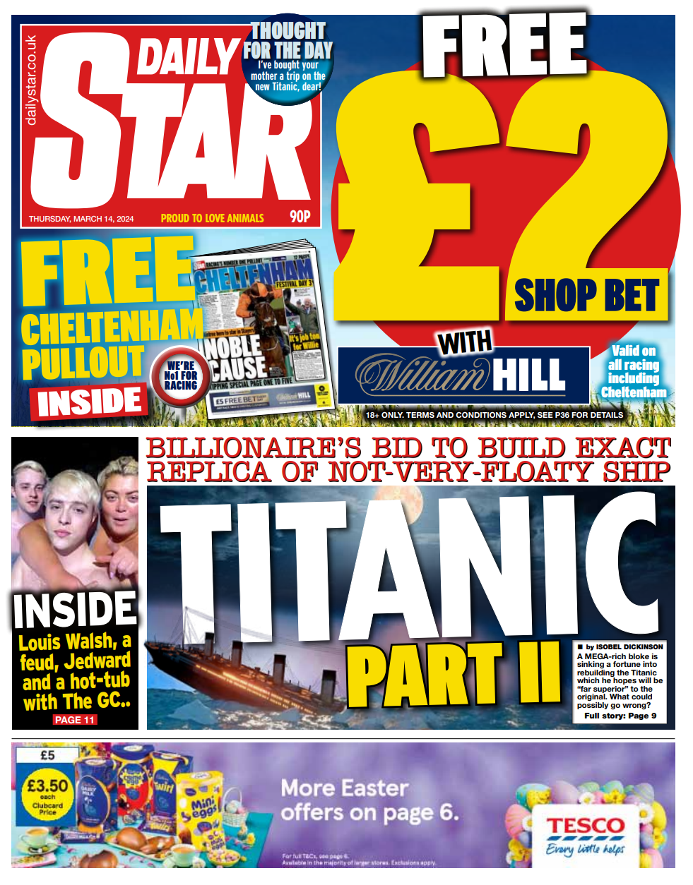 The Daily Star features a story on a billionaire’s endeavour to recreate the doomed Titanic.