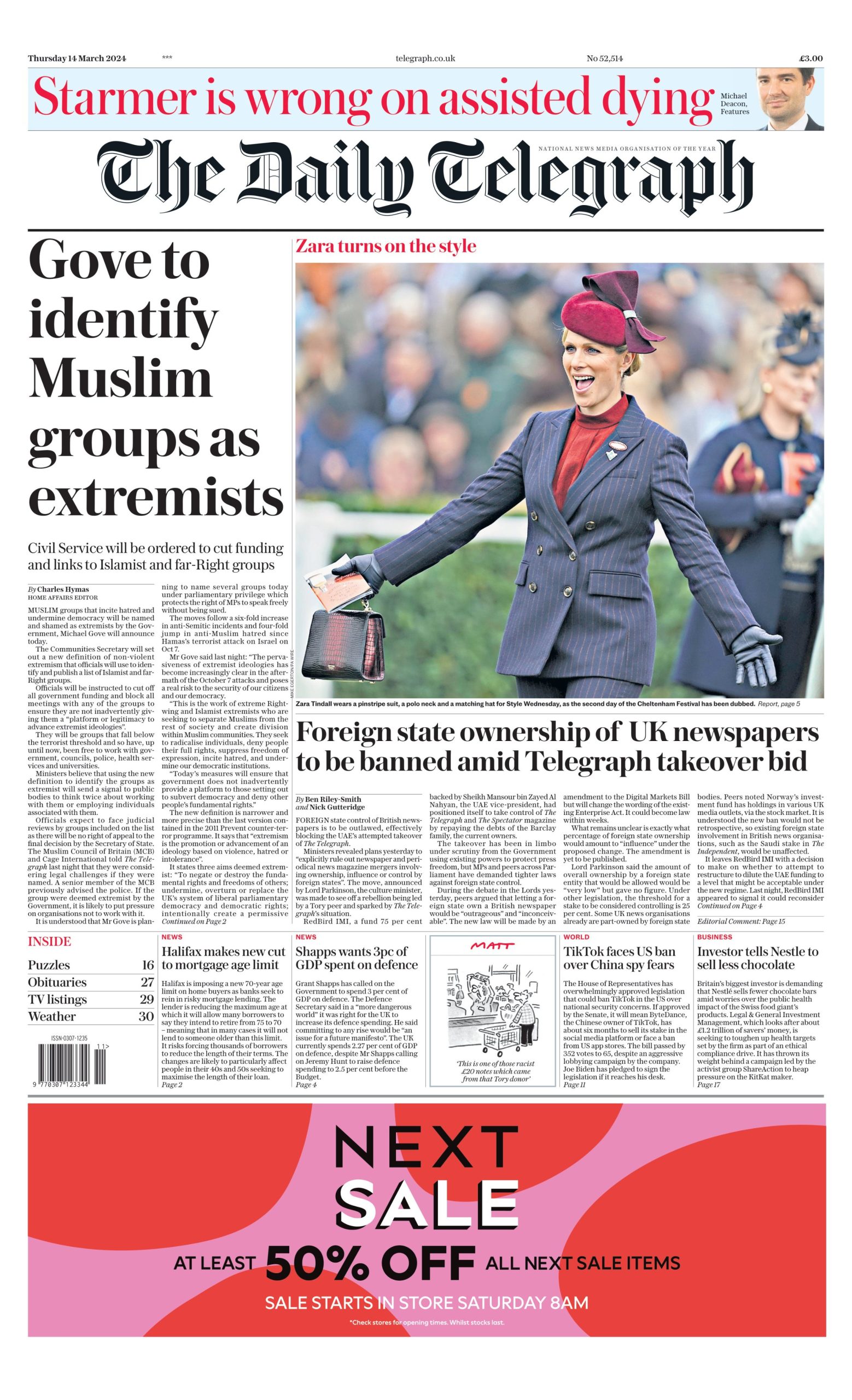 Daily Telegraph reports on Gove’s upcoming new extremism definition announcement.