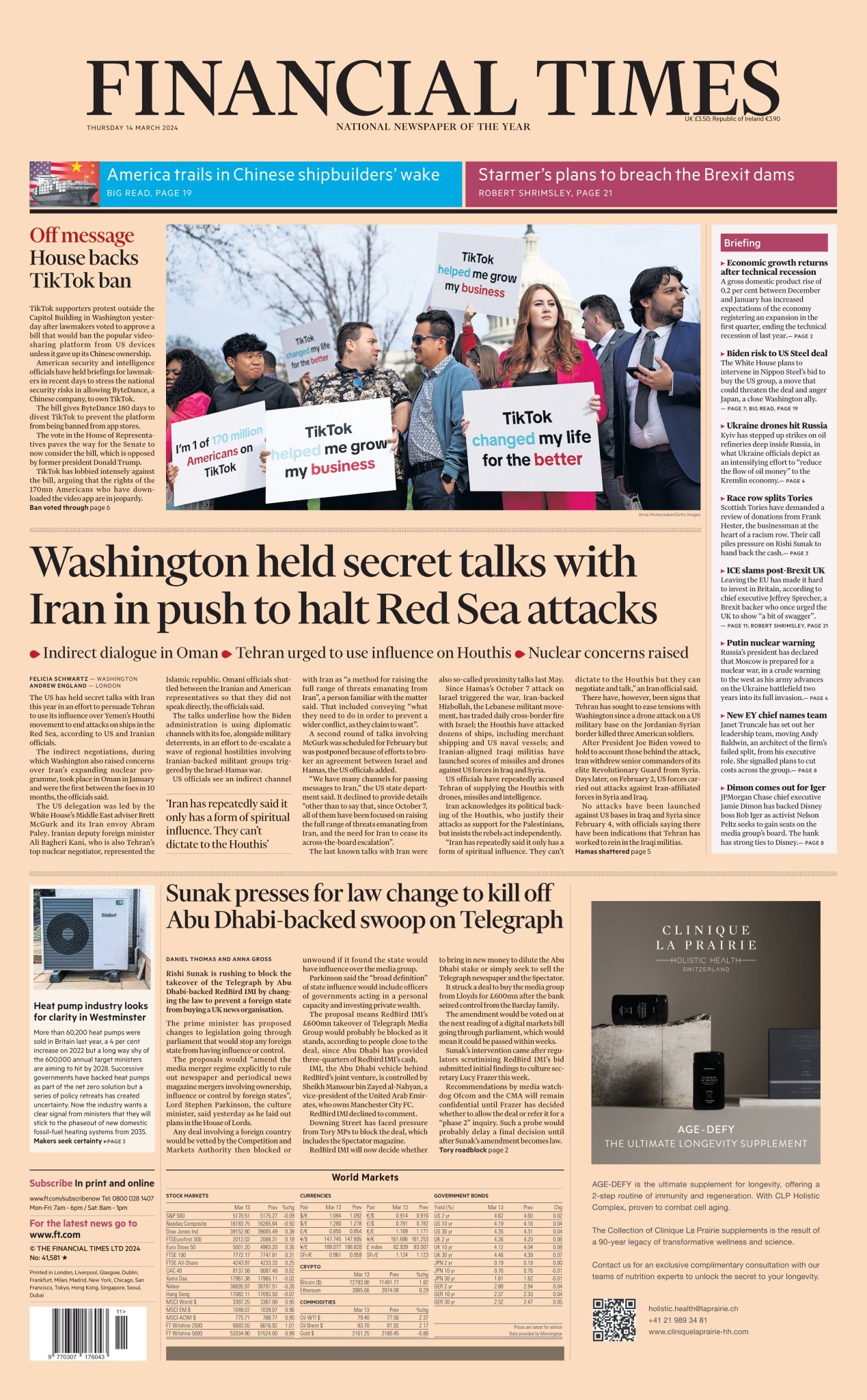 The Financial Times discloses secret discussions between US and Iranian officials to halt Houthi rebel attacks on Red Sea vessels.