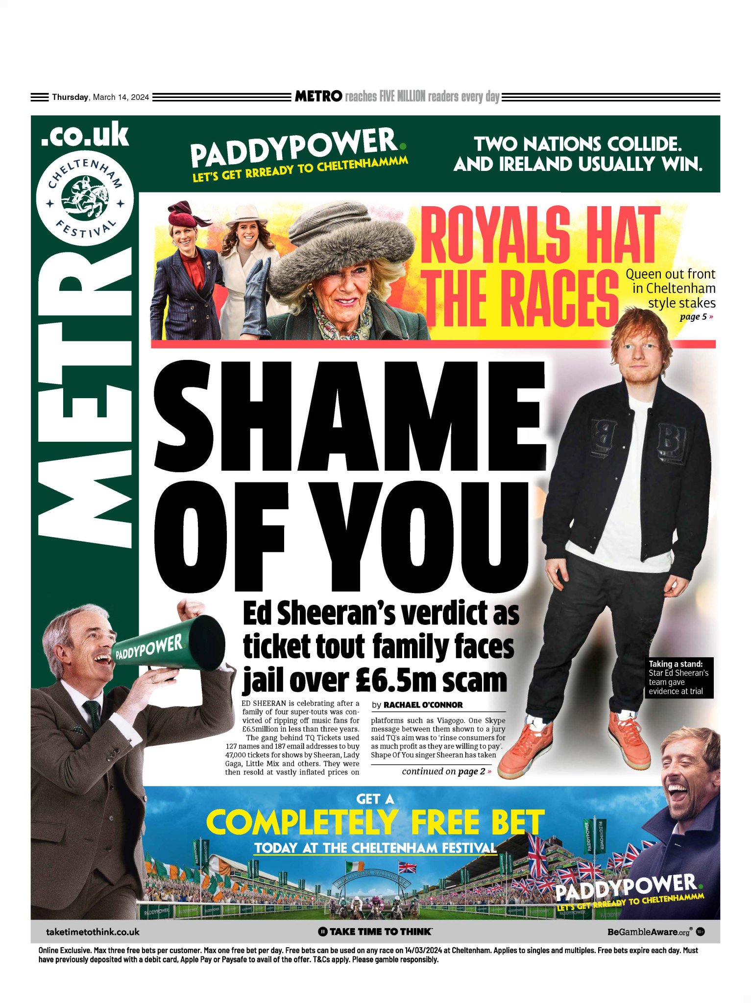 The Metro reports on the condemnation by Ed Sheeran’s management of ticket fraudsters who resold thousands of concert tickets.