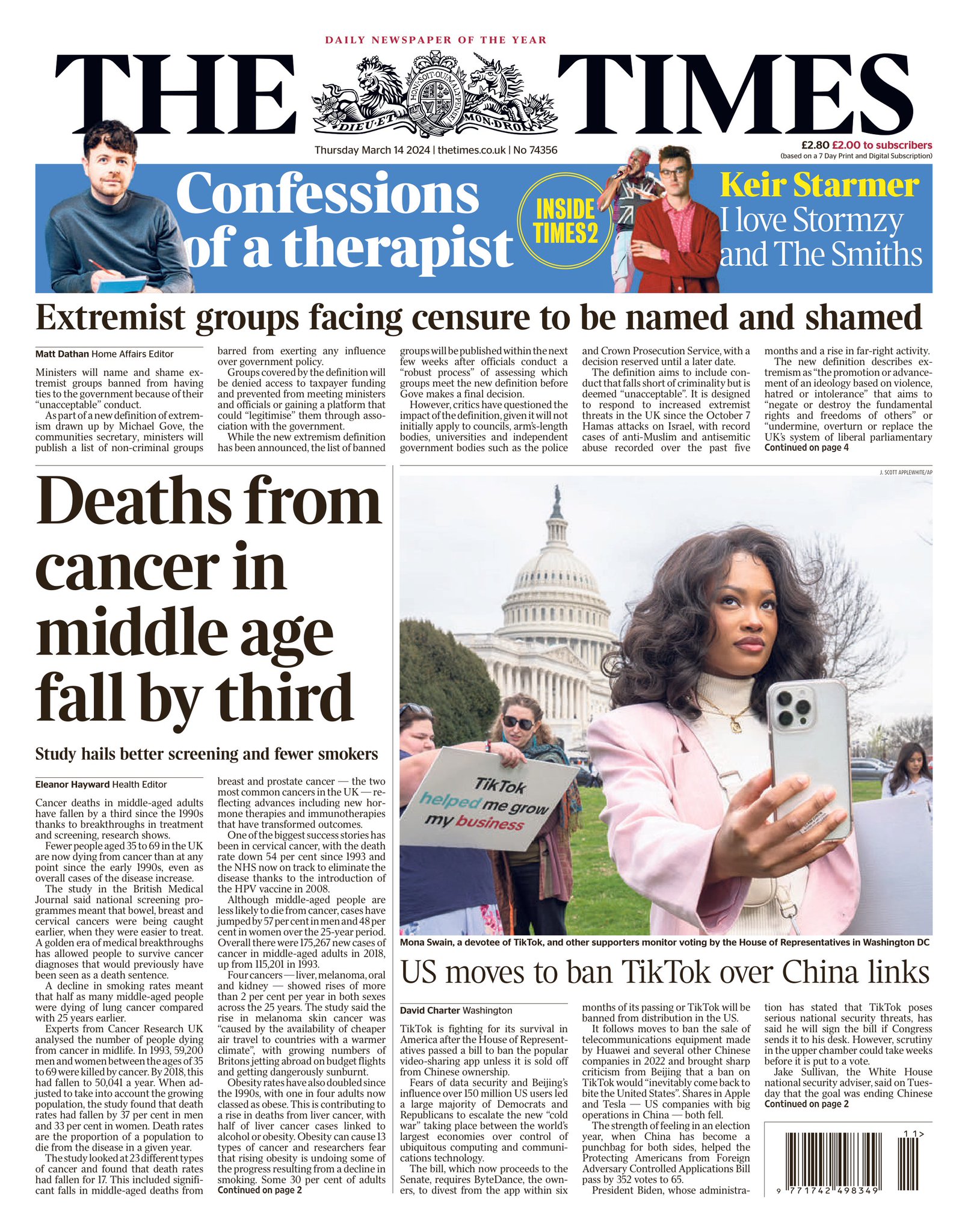 The Times highlights new studies revealing a one-third reduction in middle-aged cancer fatalities since the 1990s, attributed to improved screening and smoking decline.