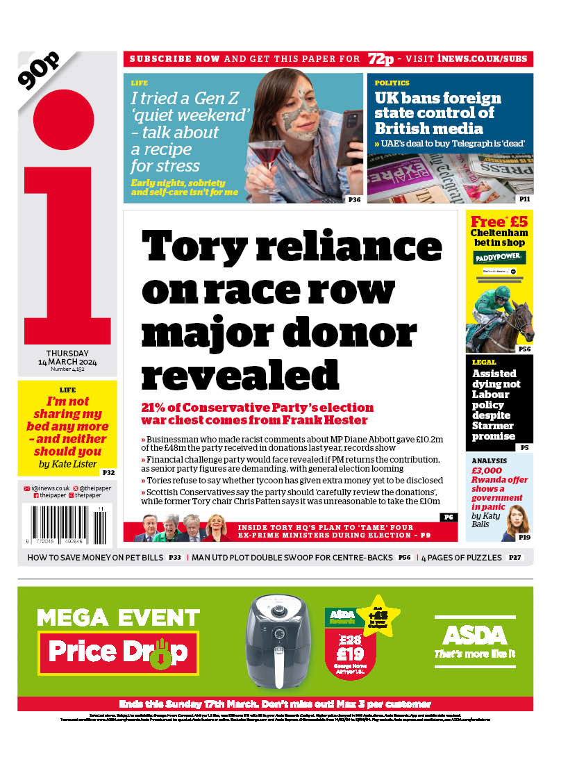 The Daily Mirror highlights a Tory minister’s willingness to accept further party funding from a controversial donor who made offensive remarks about MP Diane Abbott.