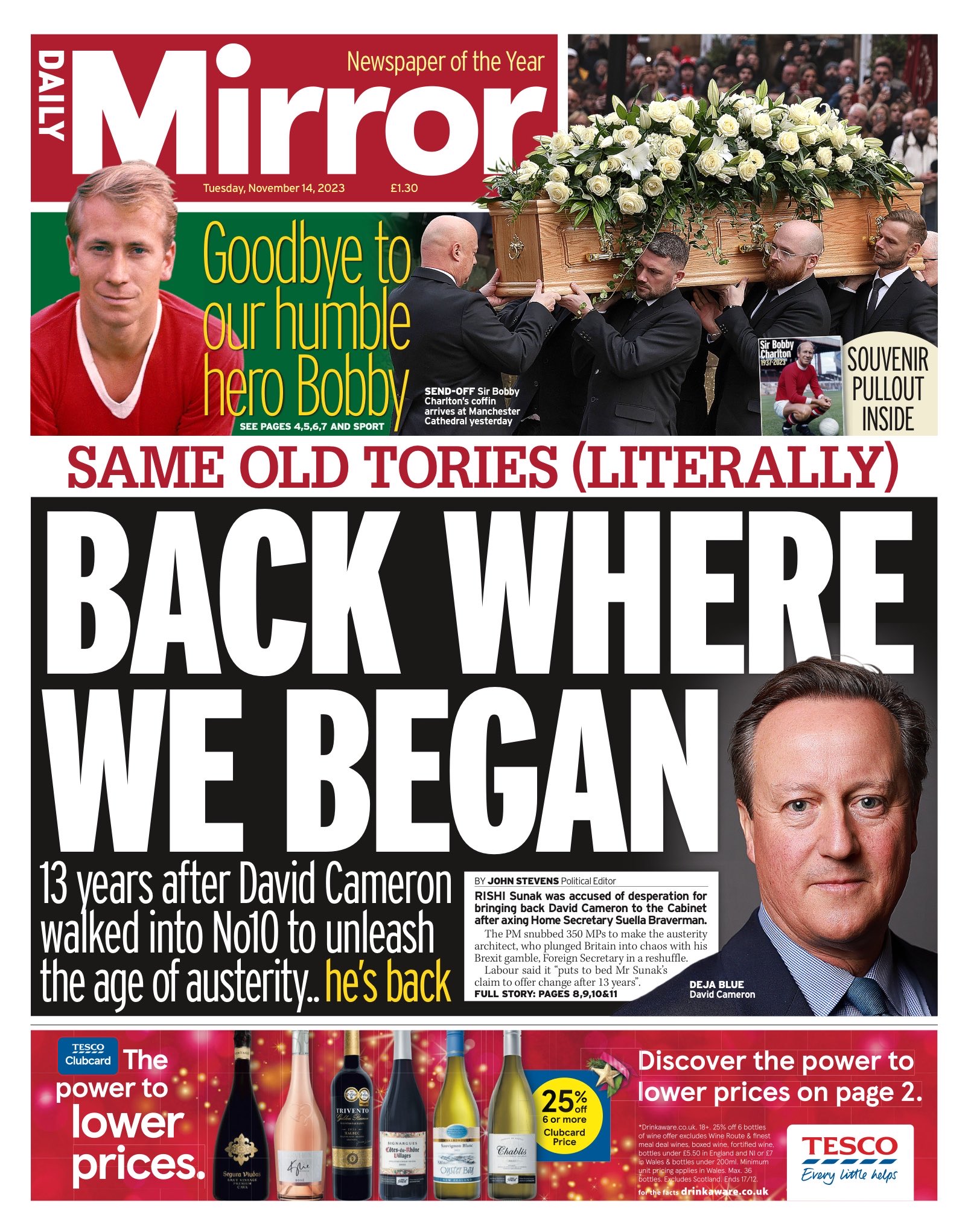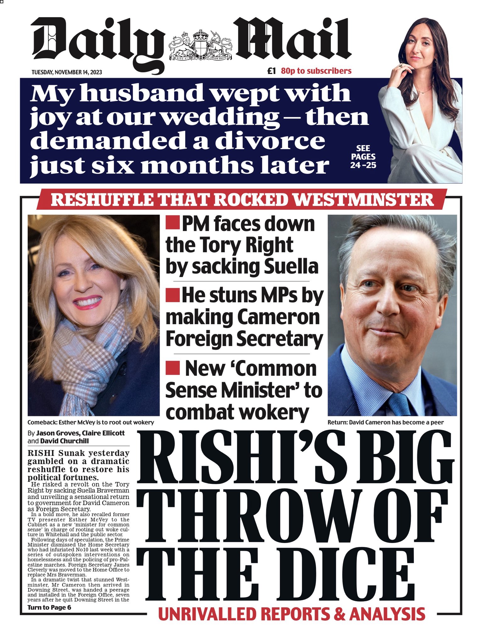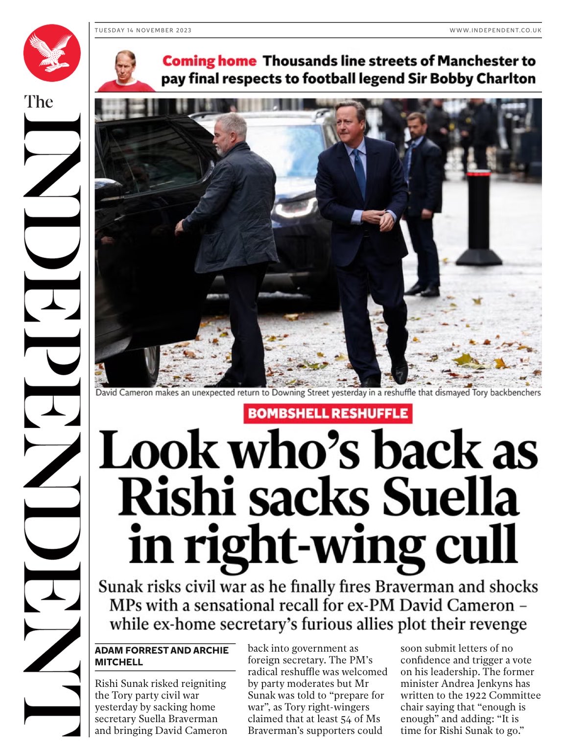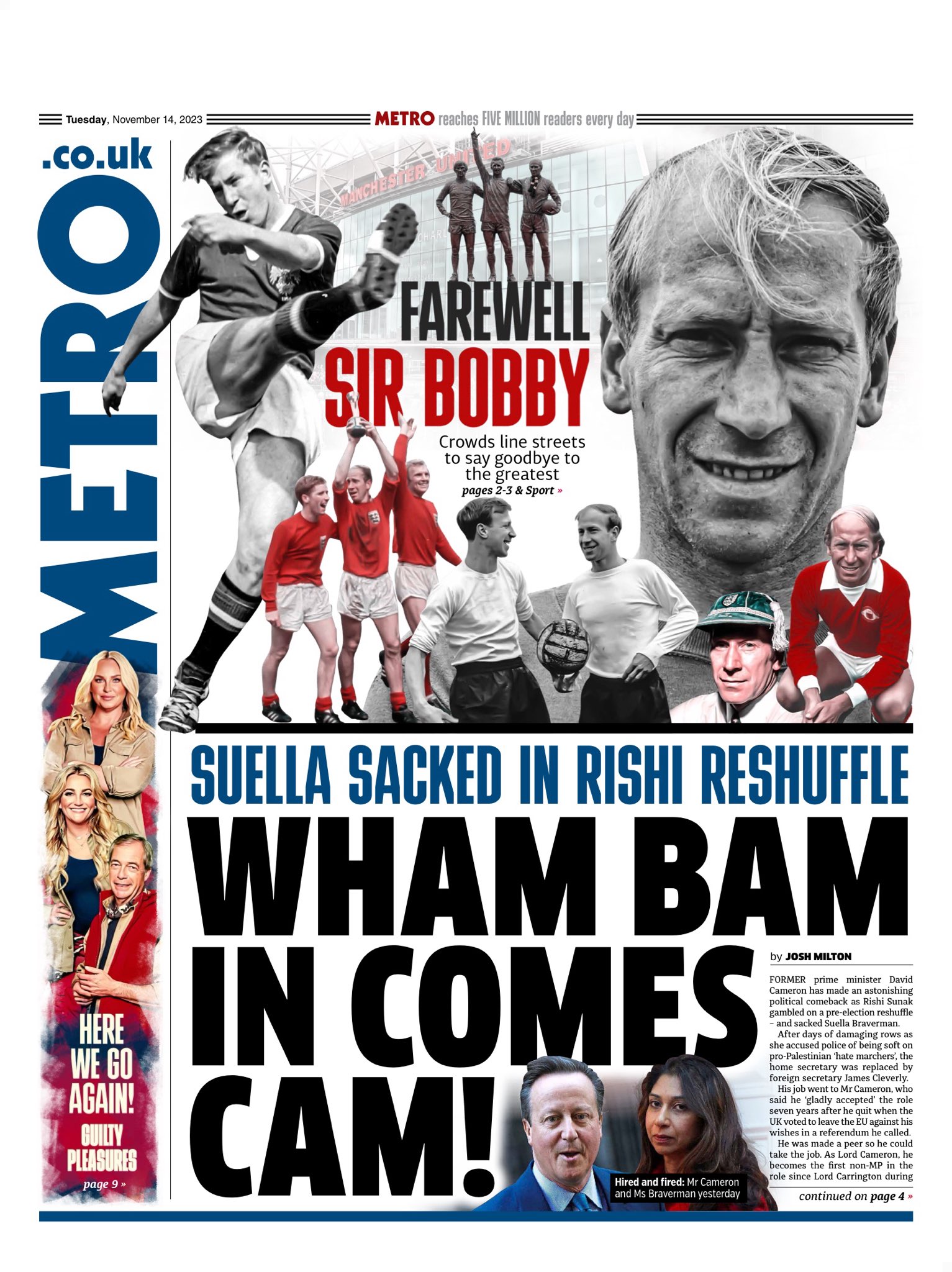 The Metro reports on Suella Braverman’s dismissal as home secretary and David Cameron’s cabinet comeback as foreign secretary.