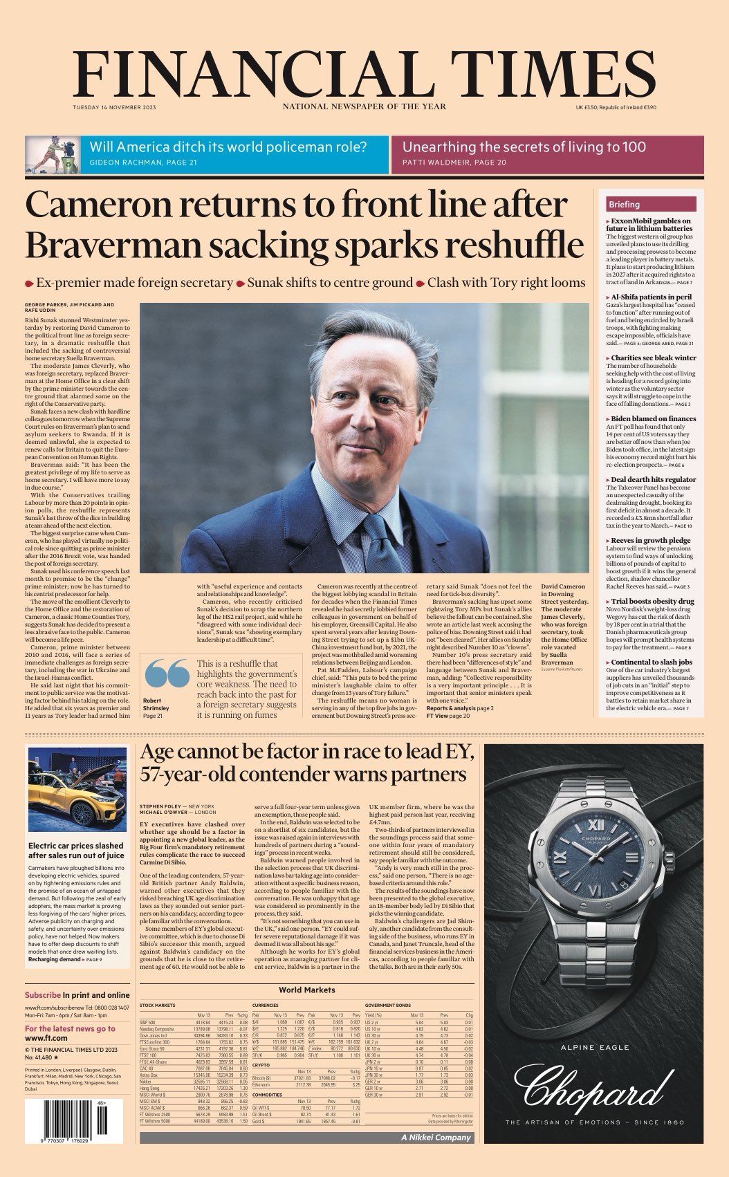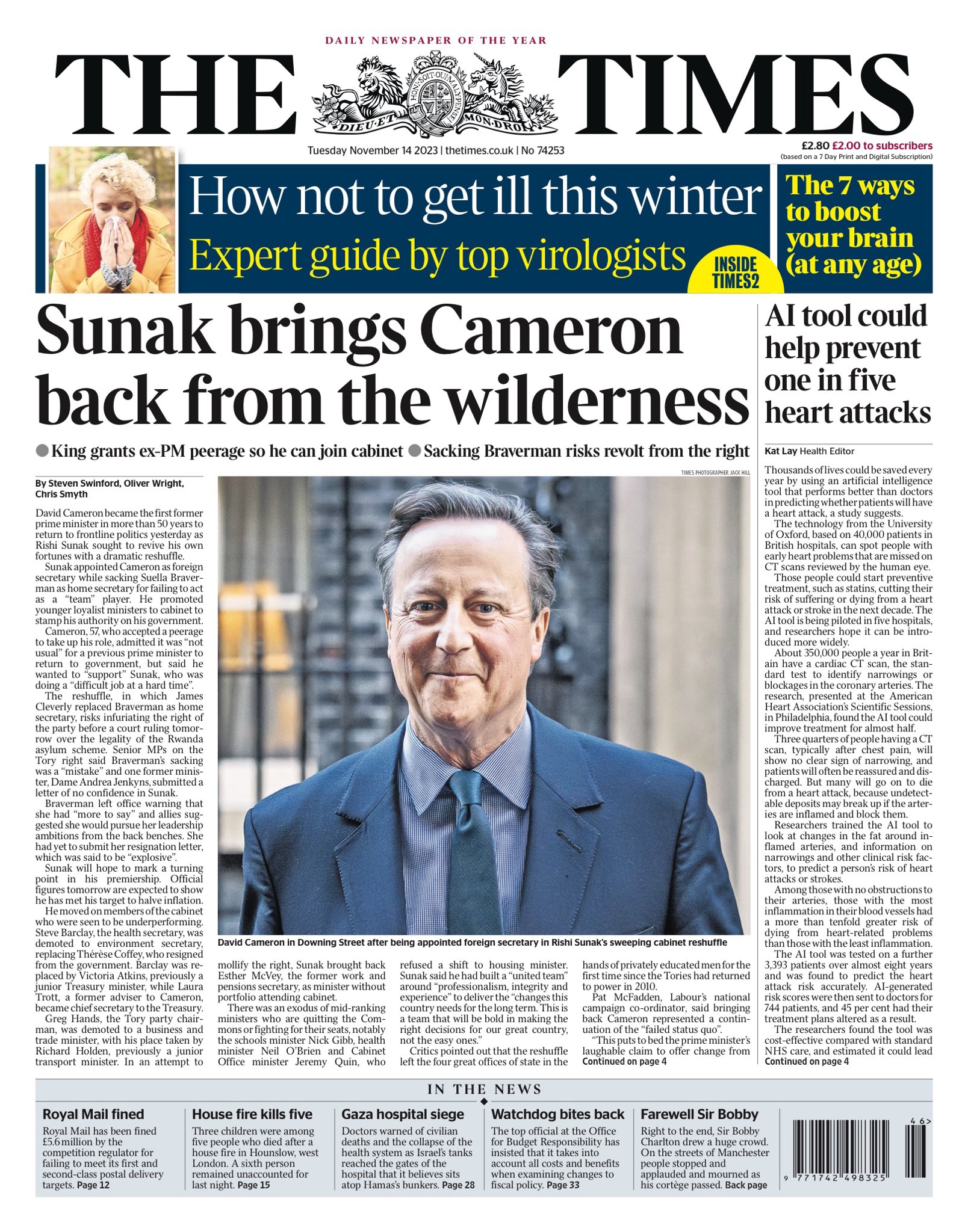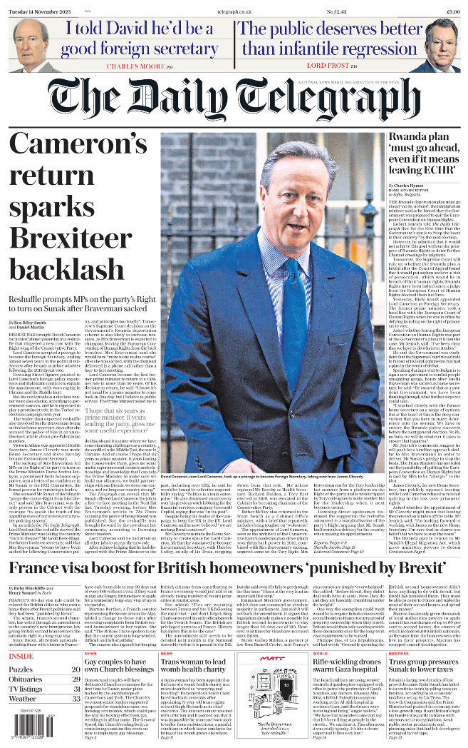 “The Times reports on Sunak’s surprising cabinet reshuffle involving Cameron’s return.