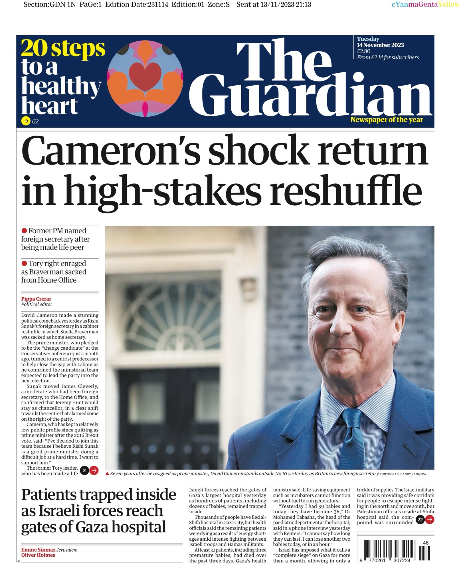 The Guardian reports on David Cameron’s unexpected return to the cabinet as foreign secretary, as part of Rishi Sunak’s high-stakes reshuffle.